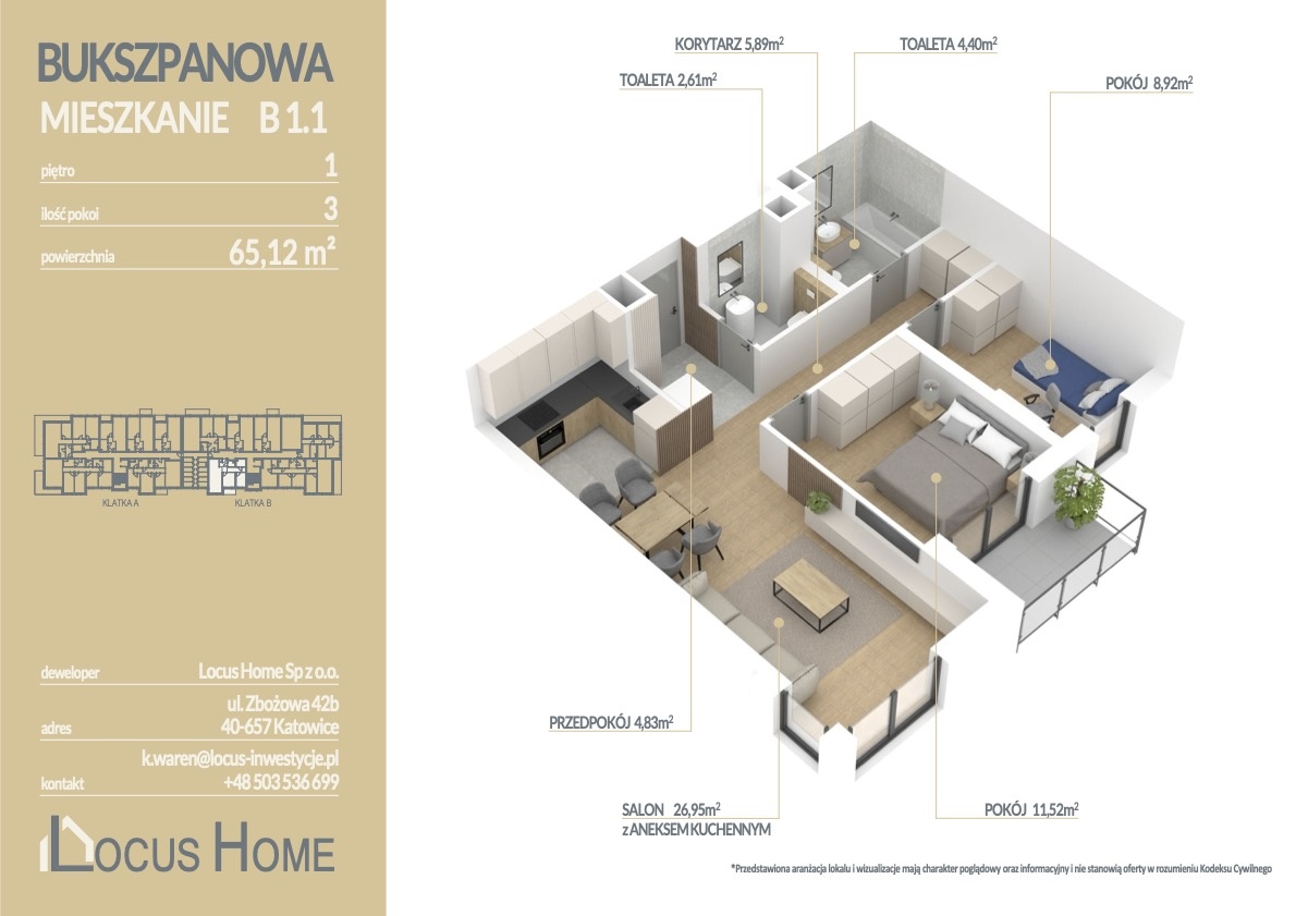 Przedstawiamy ofertę mieszkania 3 - pokojowego o powierzchni 65,12 m² z balkonem, zlokalizowanego na pierwszym piętrze budynku, oznaczonego nr B 1.1