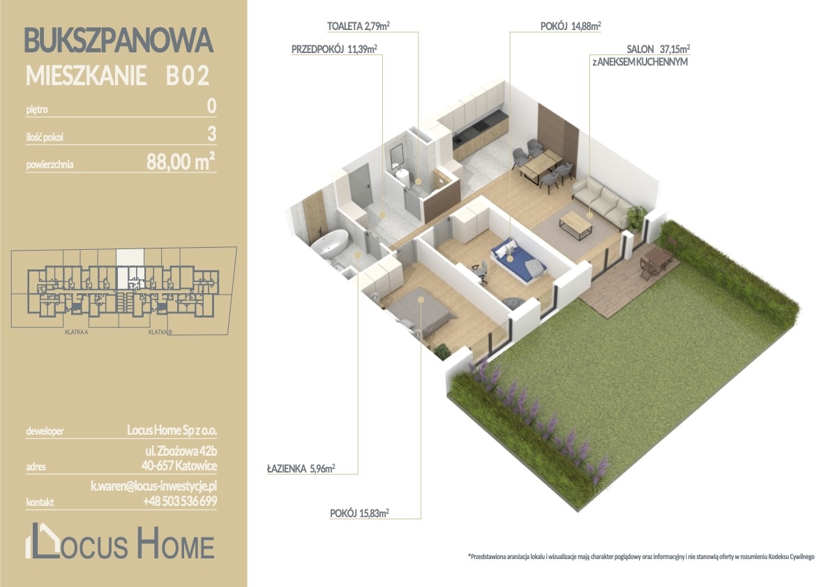 Przedstawiamy ofertę mieszkania 3 - pokojowego o powierzchni 88 m² z OGRÓDKIEM 76 m², zlokalizowanego na parterze budynku, oznaczonego nr B 0.2