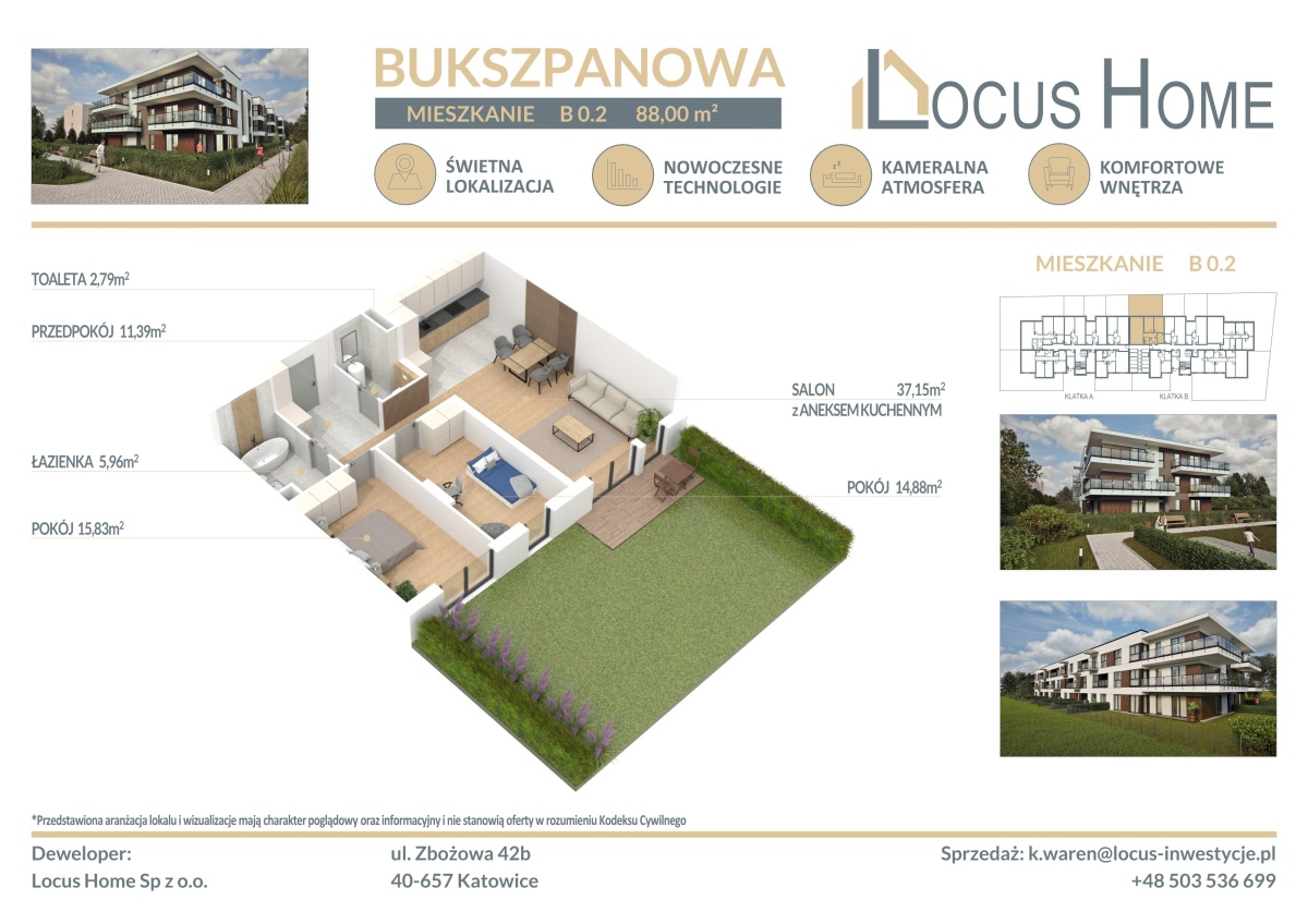 Spółka LOCUS HOME to DEWELOPER który realizuje inwestycje mieszkaniowe na terenie Katowic od wielu lat. NOWA inwestycja na ulicy BUKSZPANOWEJ (obok nr 19) w Piotrowicach to nowoczesny apartamentowiec w doskonałej lokalizacji Katowic.