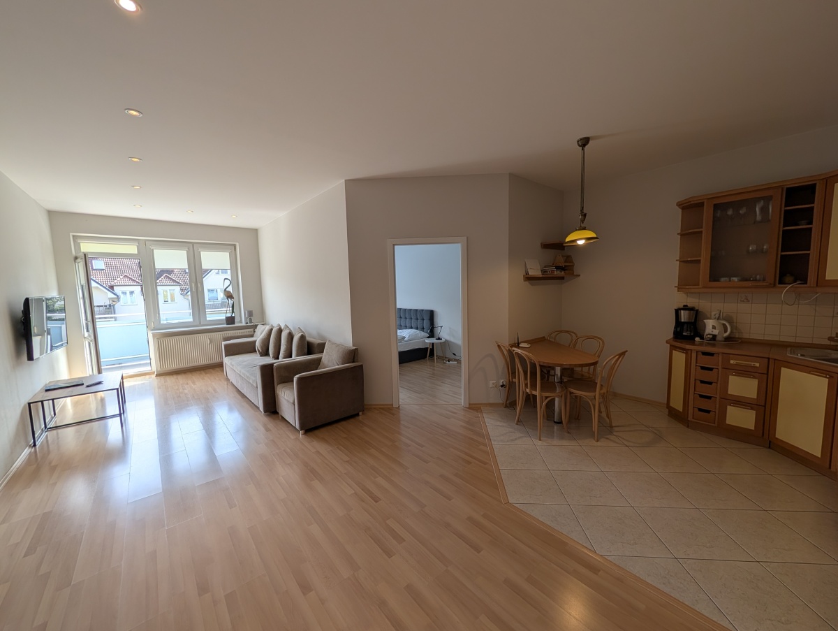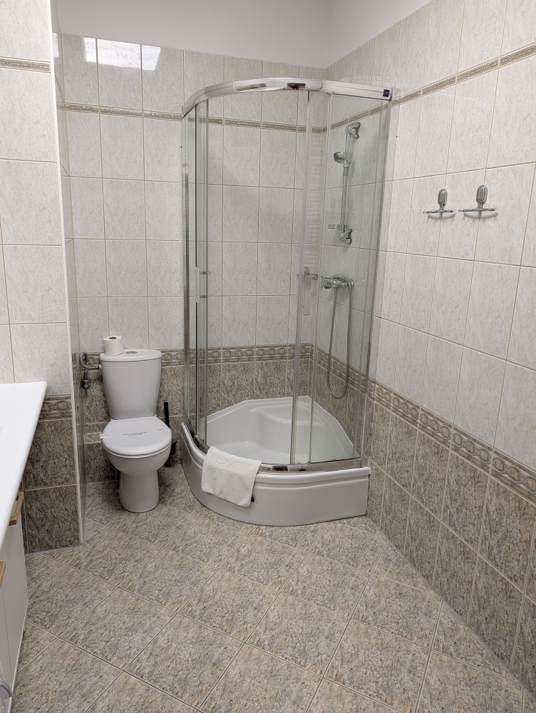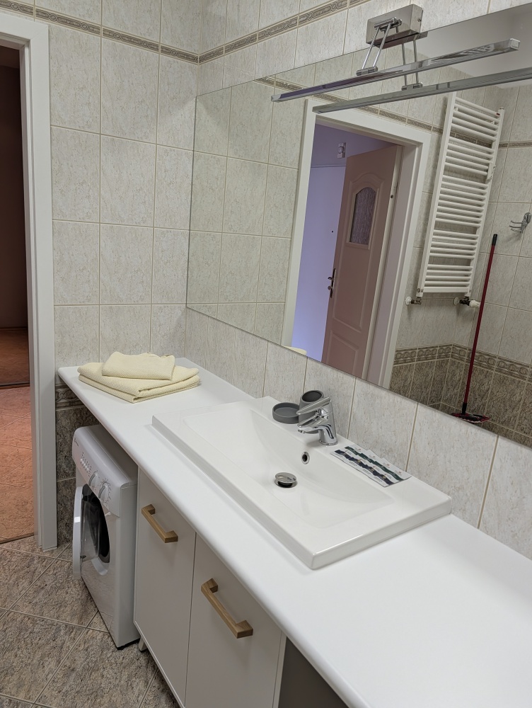 Rozkład: przestronny hol z szafą typu Komandor na całej długości ściany, łazienka z narożną kabiną prysznicową ,wygodną dużą szafką umywalkową, strefa dzienna to duże słoneczne wnętrze z wyjściem na taras oraz aneksem kuchenno-jadalnianym ,sypialnia oddzielna również bardzo jasna z wyjściem na taras.