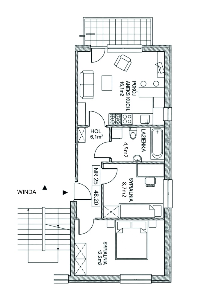 Przemyślany rozkład pomieszczeń zapewnia wygodę na co dzień. Dwie sypialnie tworzą prywatną strefę, a salon z aneksem kuchennym staje się sercem domu do wspólnego gotowania, spotkań z bliskimi i odpoczynku po pracy. Budynek dobrze izoluje od hałasu ulic, dzięki czemu można cieszyć się ciszą i spokojnym sąsiedztwem.