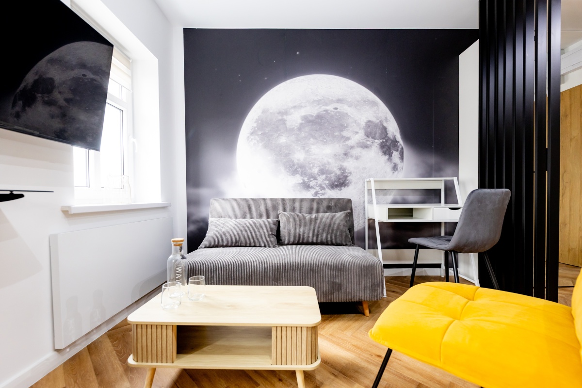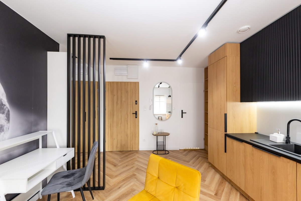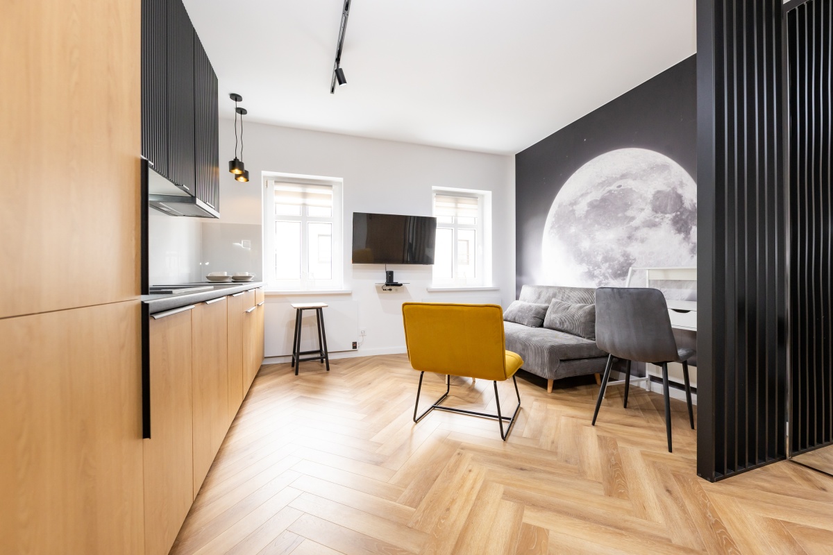 Pełne wyposażenie: Kuchnia, meble w zabudowie, indukcja, zmywarka, fotel, biurko, szafa, stoliki, kanapa, TV - wynajmujesz od pierwszego dnia.