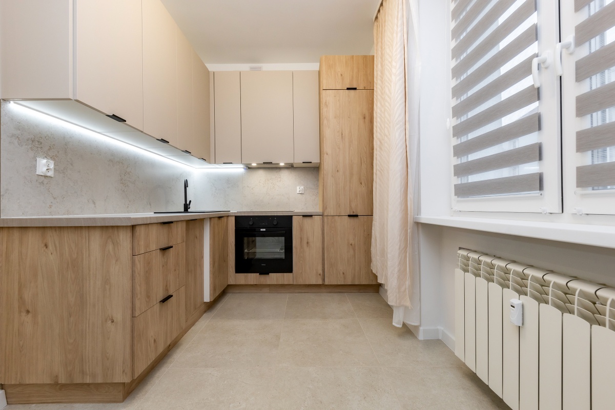 Mieszkanie o powierzchni 38,5 m² na parterze z dużą kuchnią.