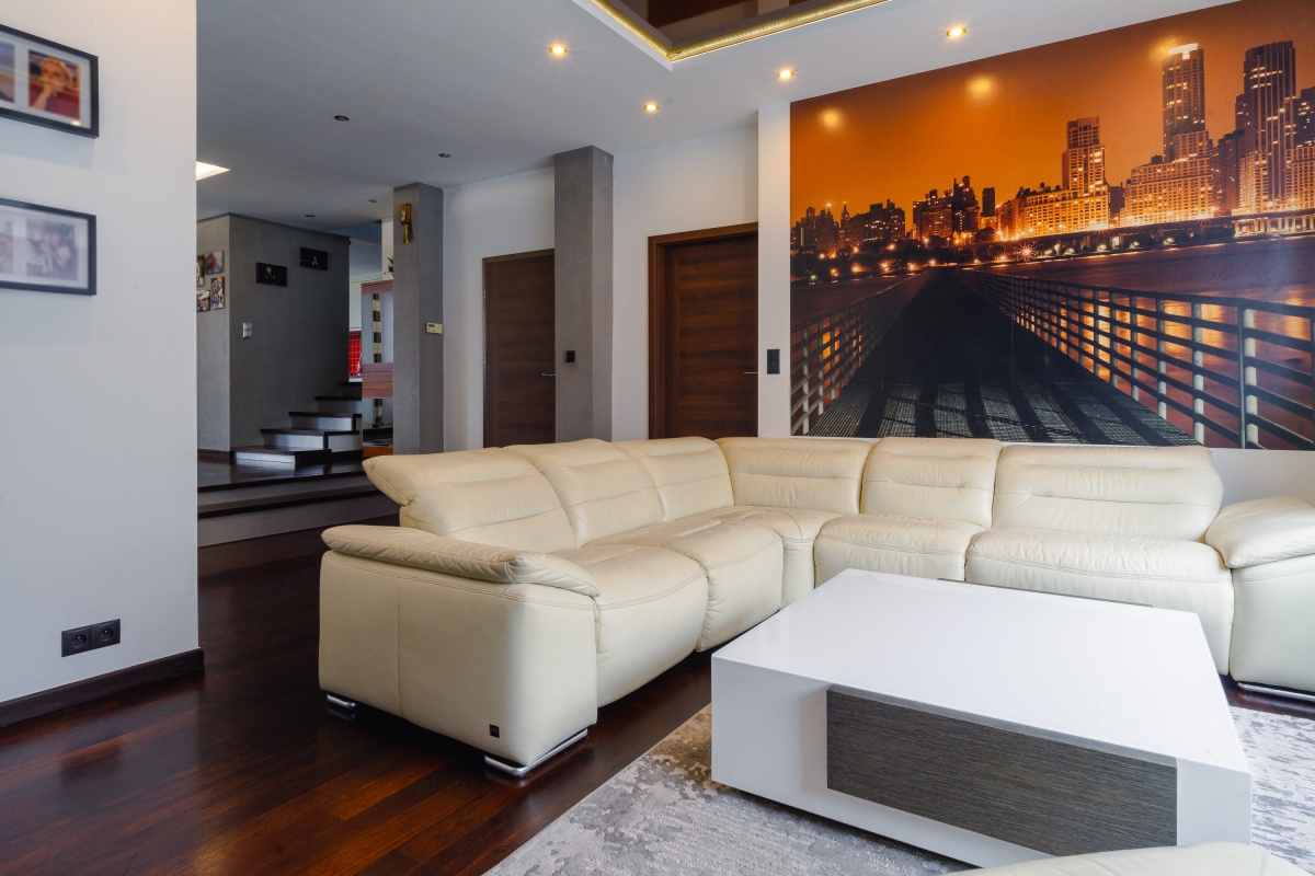 Salon (25 m²) – przestronny, z eleganckim sufitem napinanym oraz skórzanym narożnikiem z funkcją relaks