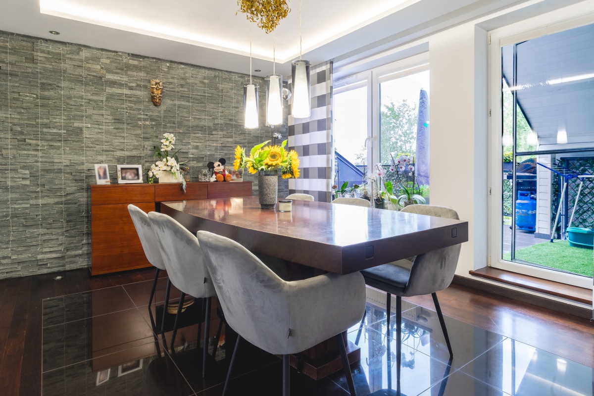 Jadalnia (21 m²) – z dużym stołem, komodą i barkiem, ozdobiona naturalnym kamieniem