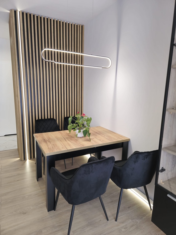 Mieszkanie wykończone wysokiej jakości materiałami z dbałością o detale. Łączy funkcjonalność z przytulnym klimatem, prywatny ogród 145m2 ogrodzony . Mieszkanie jest w pełni umeblowane w tym :