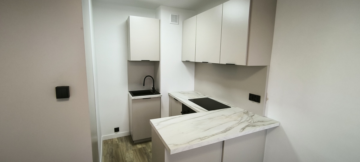 Lokal przeszedł generalny remont, podczas którego wymieniono instalacje elektryczną i wodną. Składa się z salonu z aneksem kuchennym, oddzielnej sypialni oraz łazienki z WC. Mieszkanie wyposażone jest w meble na wymiar od stolarza oraz nowe AGD w zabudowie: piekarnik, płytę indukcyjną, zmywarkę i pochłaniacz.