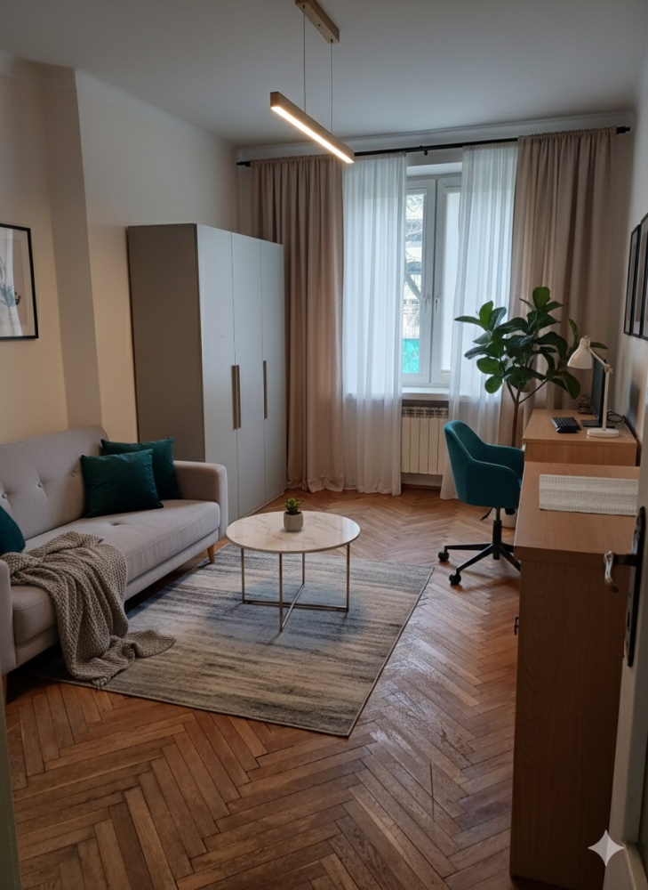 - Pomieszczenia dodatkowe: Oddzielna widna kuchnia, łazienka z WC, przestronny przedpokój.