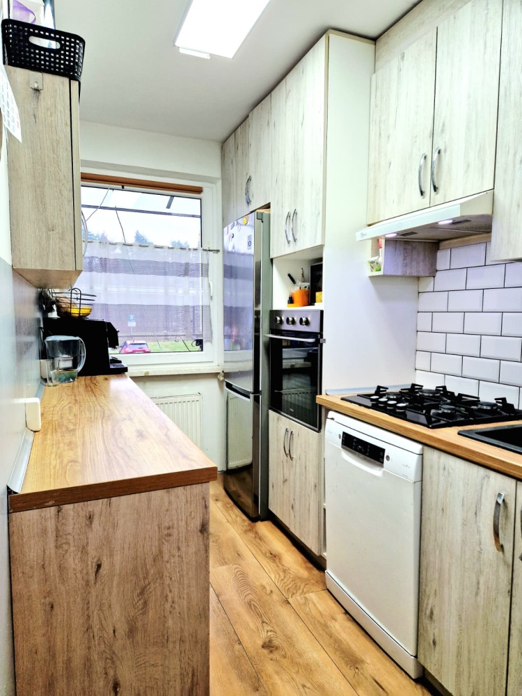 Kuchnia w zabudowie z AGD: piekarnik, płyta gazowa, okap, zmywarka, lodówka
