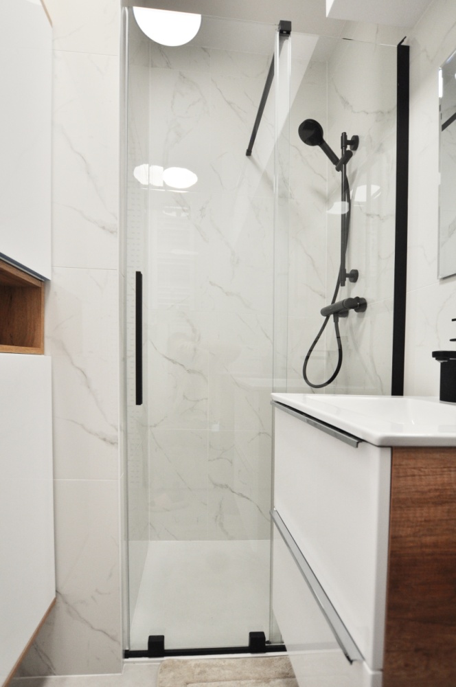 - łazienka w nowoczesnym wykończeniu: duża kabina prysznicowa, deszczownica, czarna armatura, zabudowa meblowa, pralka