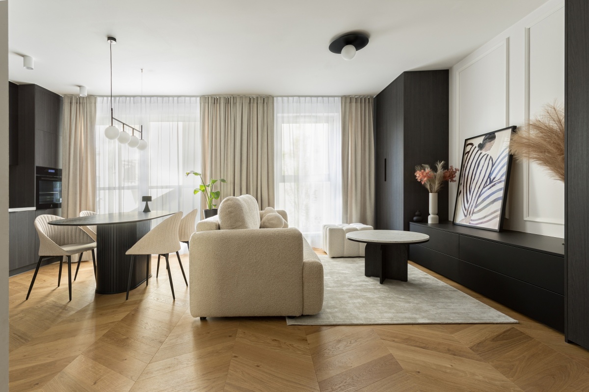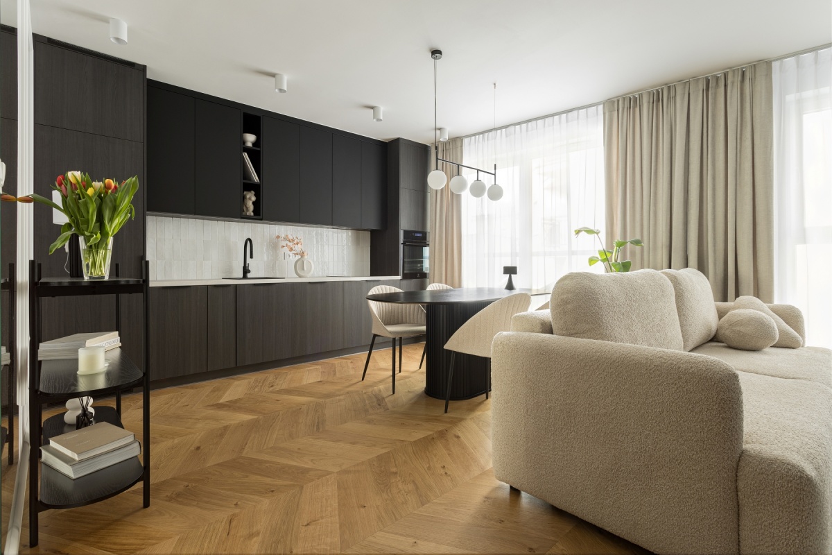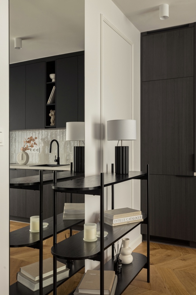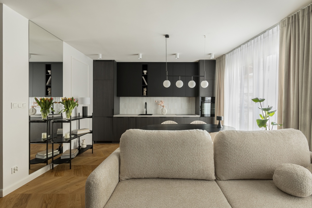 *Ciemna zabudowa na tle jasnych kolorów oraz ciepłej podłogi i mięsistych tkanin ma za zadanie wprowadzenie do pomieszczenia elegancji i szyku i jest alternatywą dla ogólnie dostępnych aranżacji.