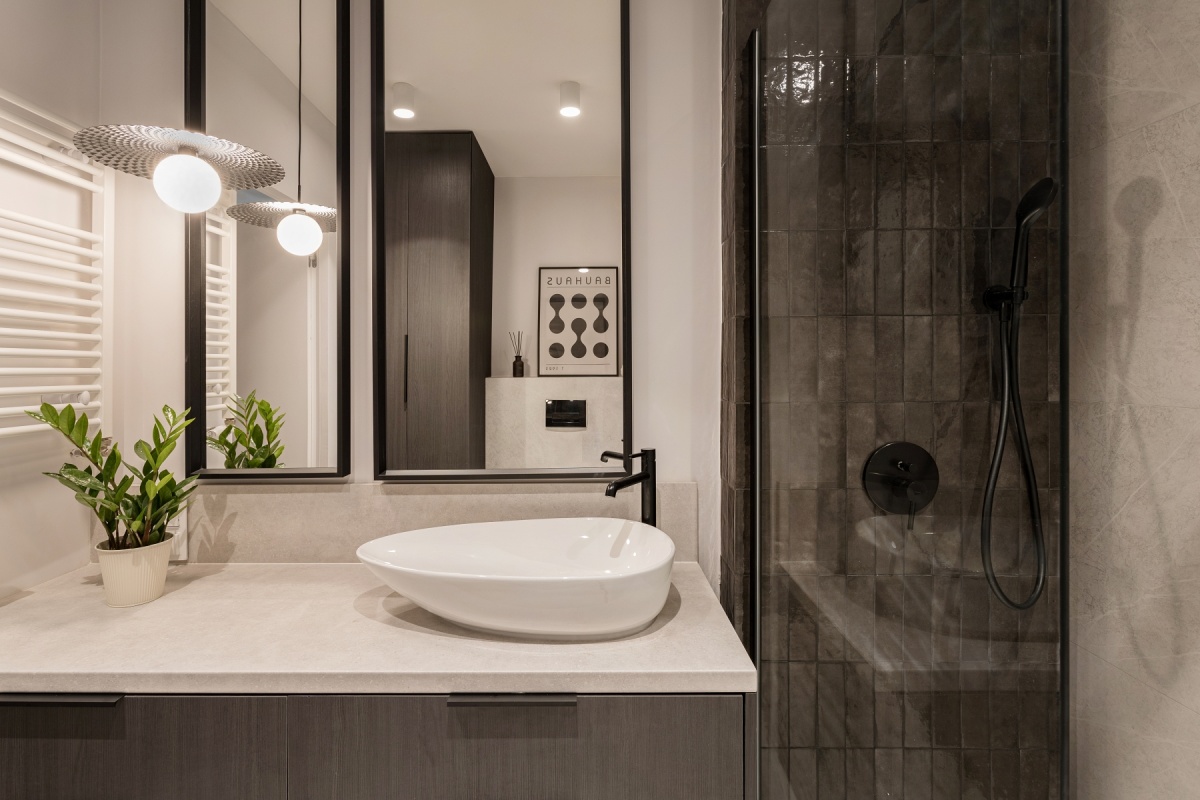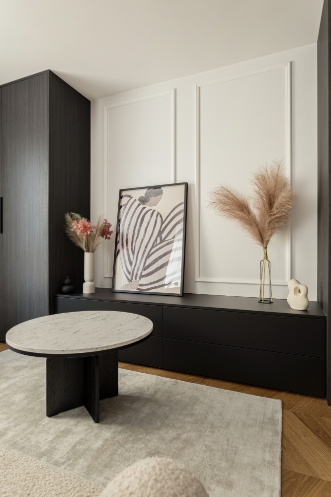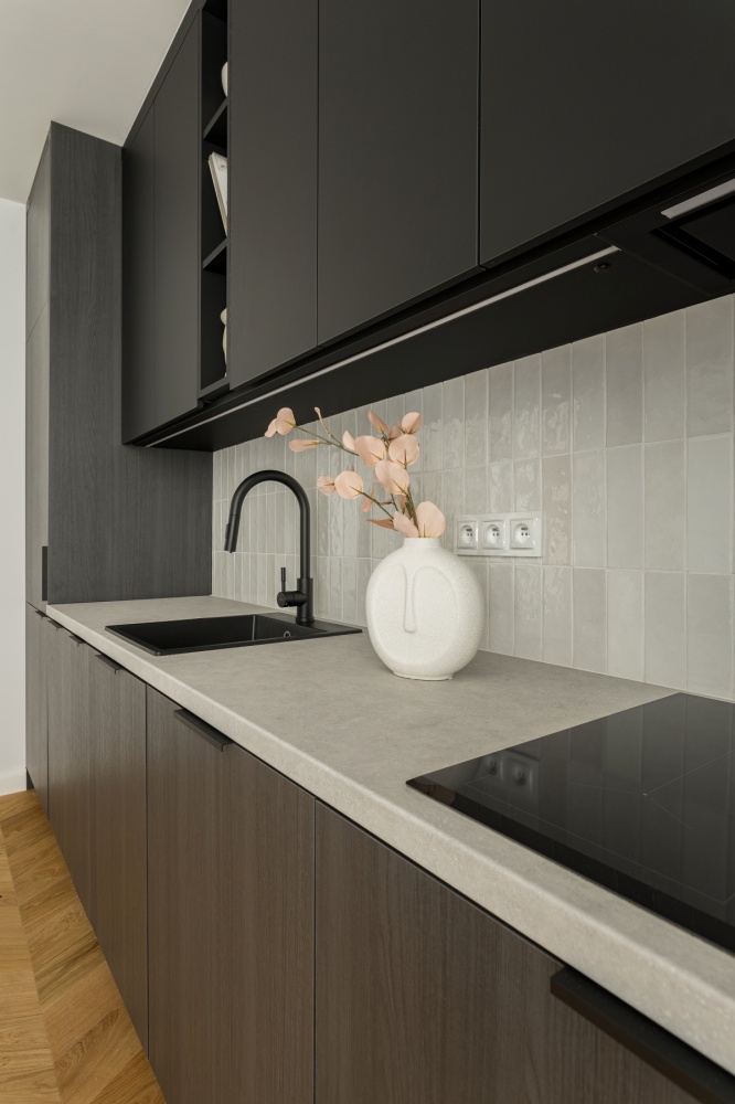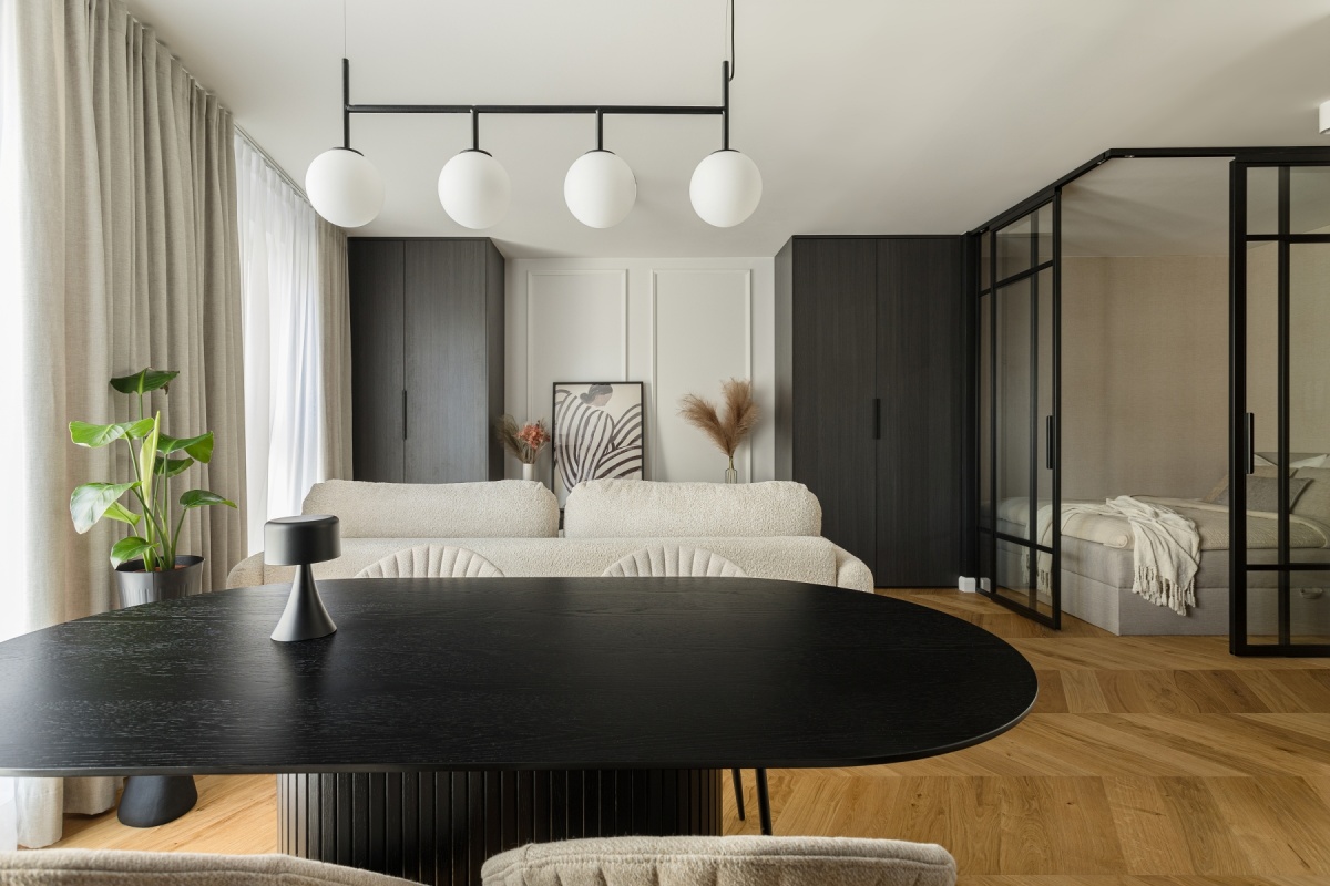 *Ciemna zabudowa na tle jasnych kolorów oraz ciepłej podłogi i mięsistych tkanin ma za zadanie wprowadzenie do pomieszczenia elegancji i szyku i jest alternatywą dla ogólnie dostępnych aranżacji.