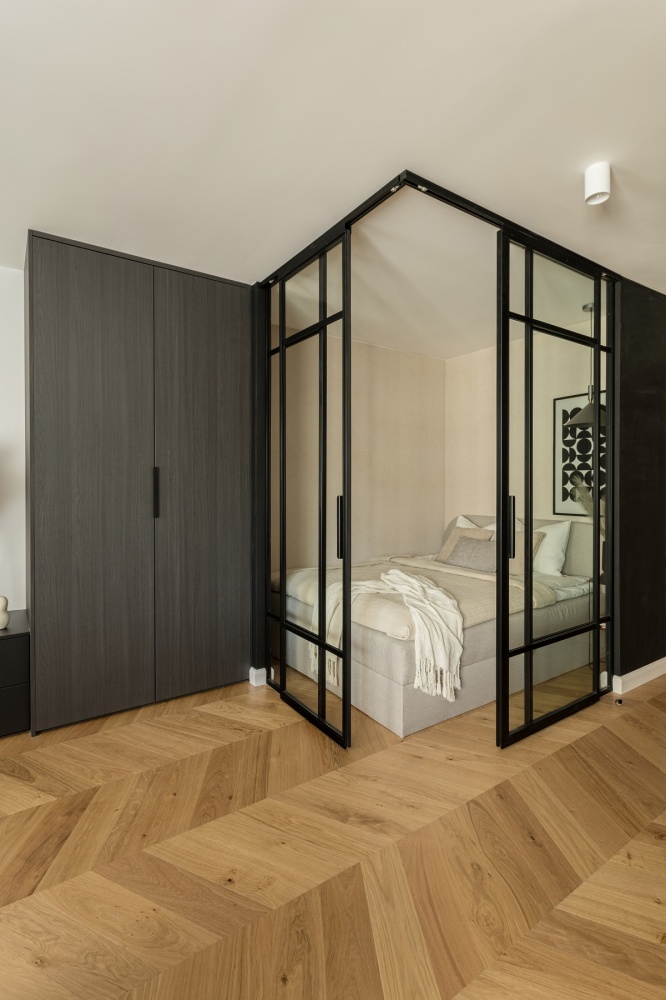 *Podłoga wyłożona jest parkietem drewnianym dębowym, ultra mat, faza, szczotkowany, wzór jodełka węgierska.
