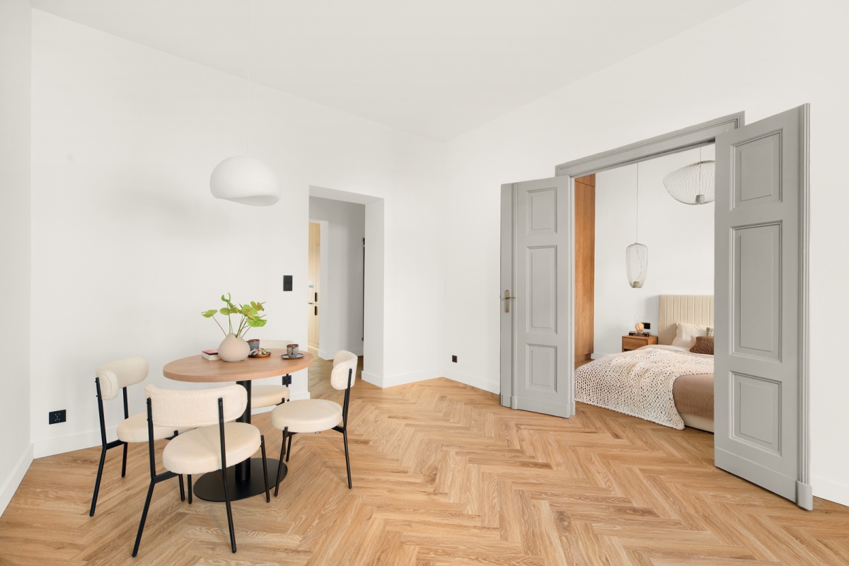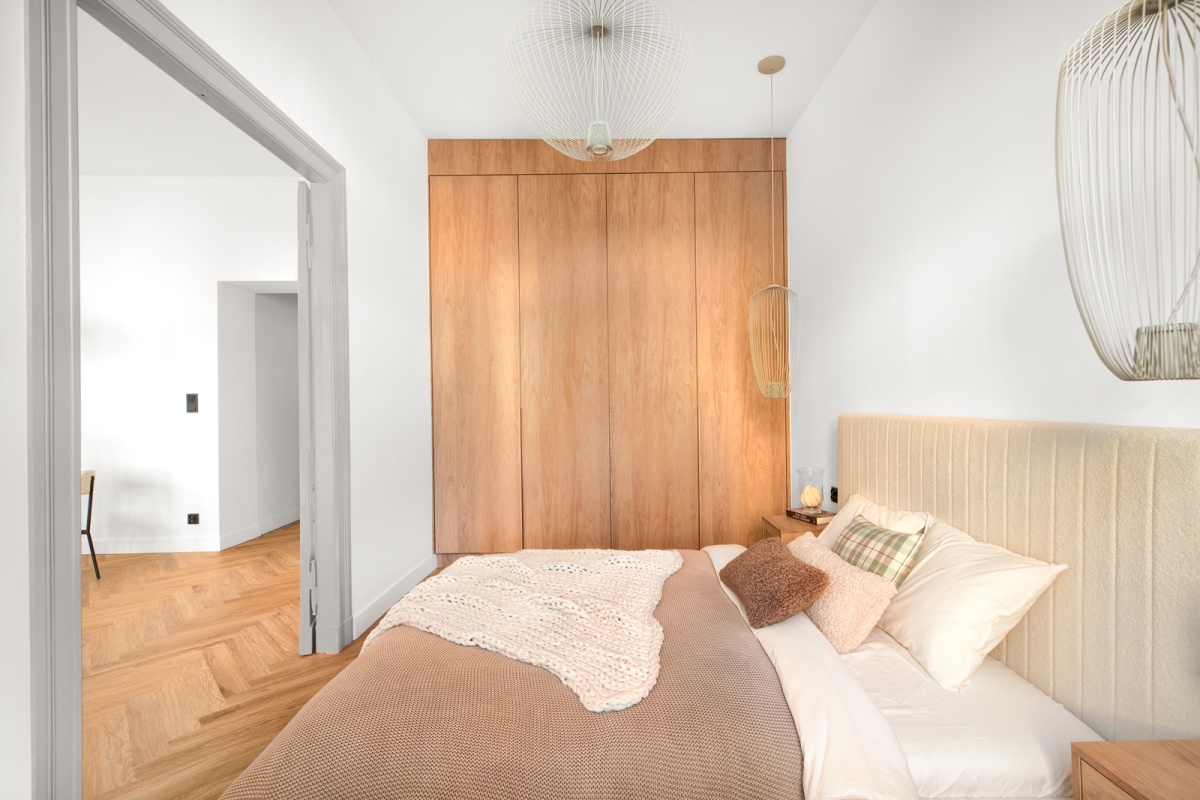 - przestronna sypialnia, do której prowadzą odrestaurowane, kamieniczne dwuskrzydłowe drzwi w kolorze szarym,