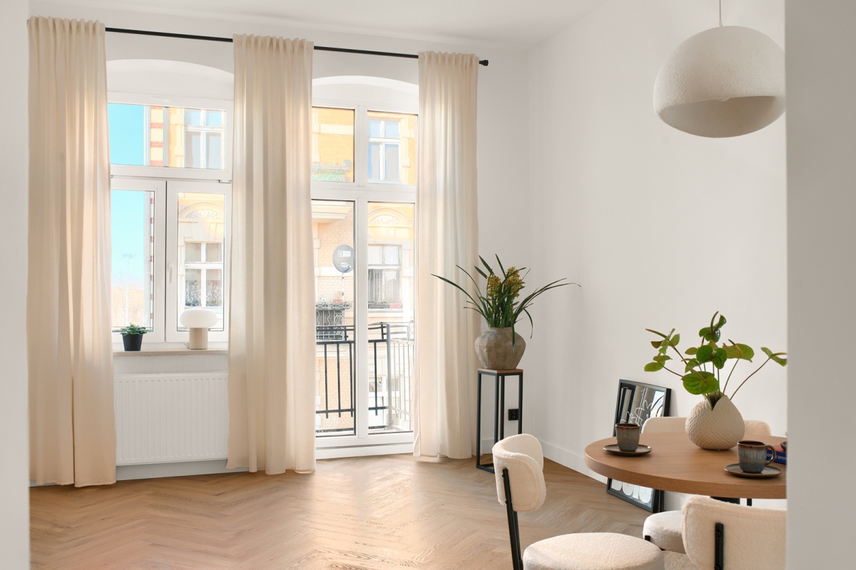 - w oknach kremowe zasłony.
