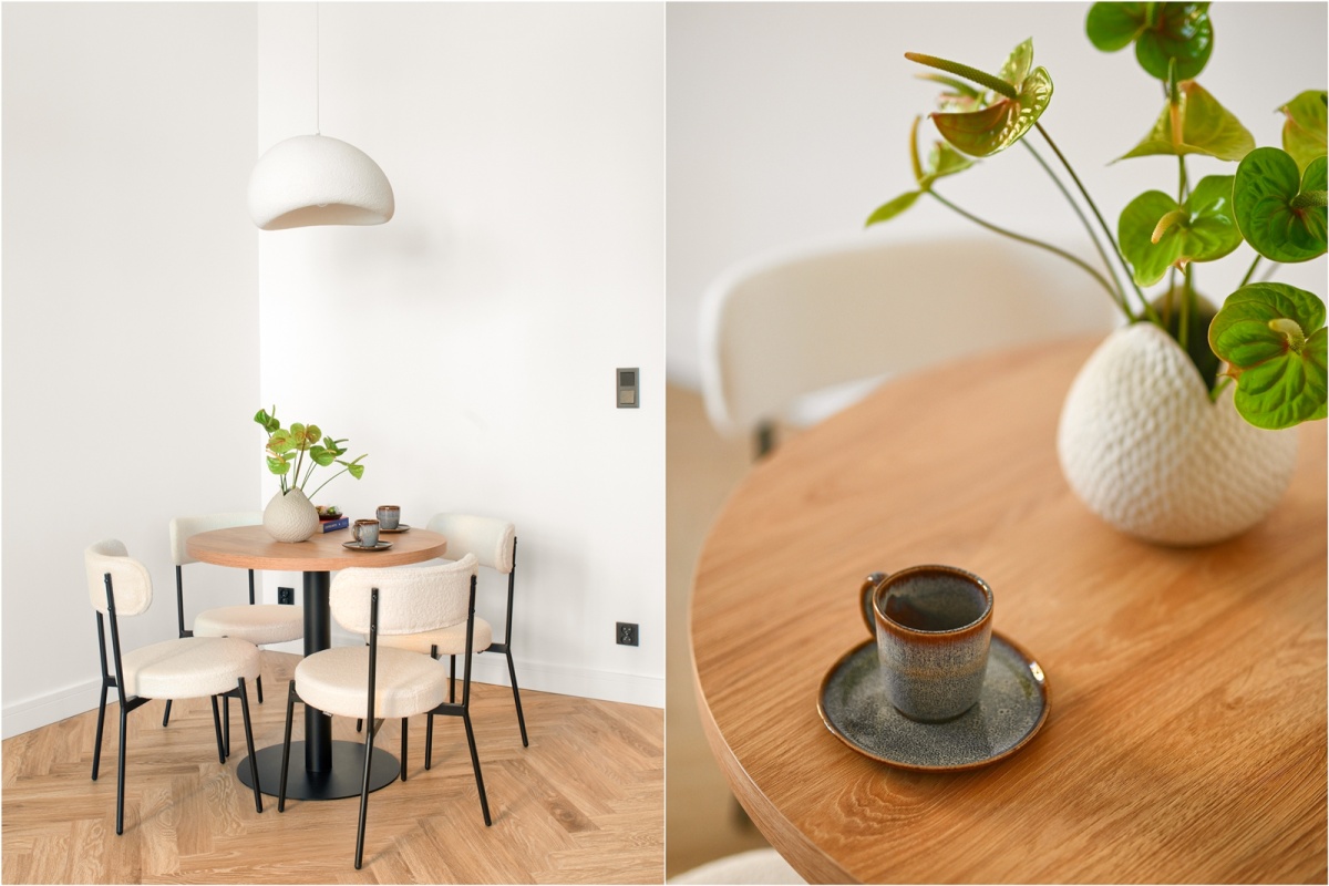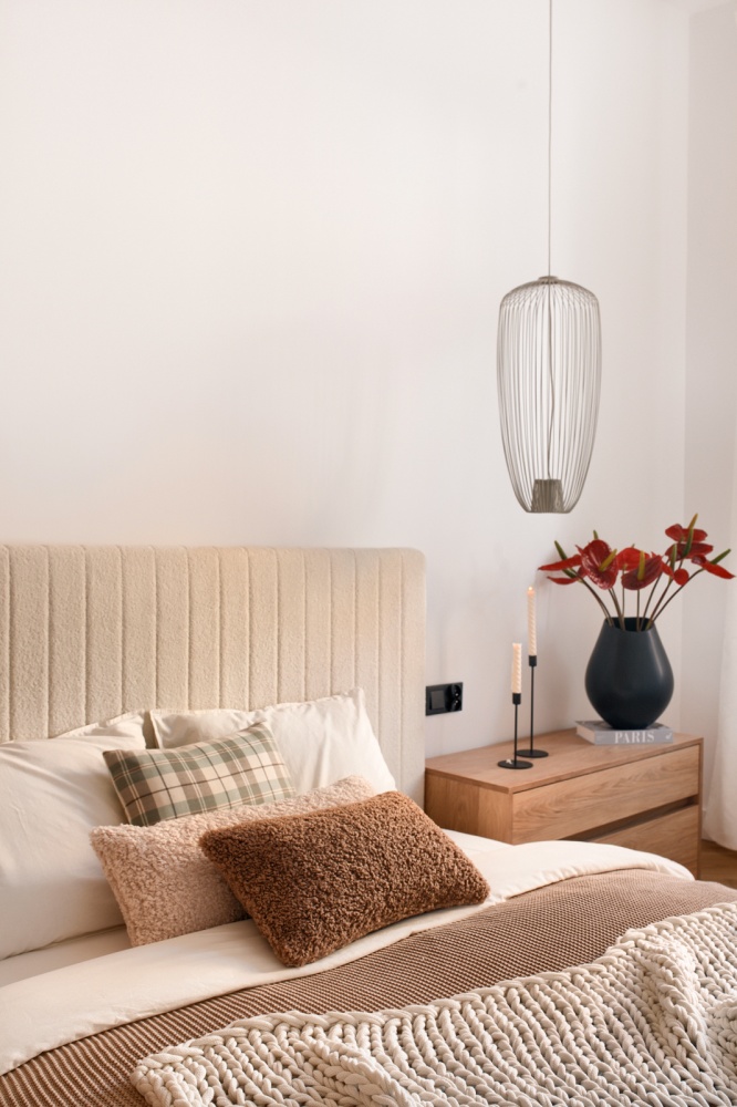 - na wyposażeniu boucle’owe łóżko oraz pojemne stoliki nocne wykonane na zamówienie,