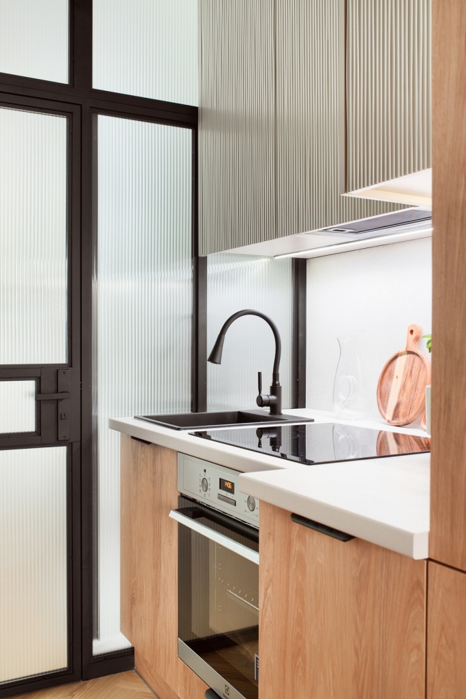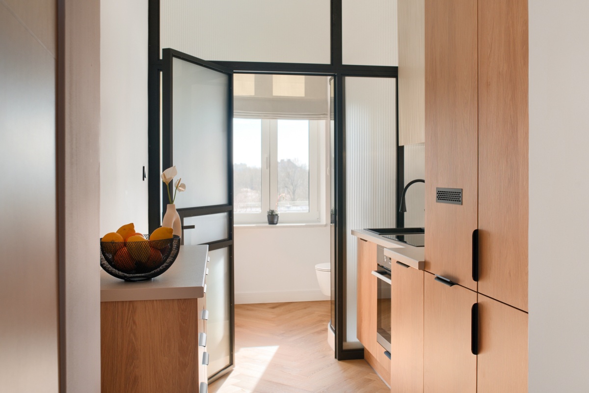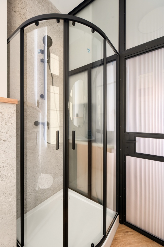 - do łazienki prowadzą drzwi osadzone na metalowo-szklanej ścianie wykonanej według naszego indywidualnego projektu na zamówienie. Szkło matowe, dwuwarstwowe, ryflowane,
