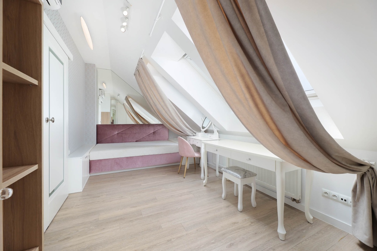 2. Poziom górny ok. 37 m2- główna sypialnia (ok. 17 m2), dodatkowy pokój (ok. 10 m2), łazienka (ok. 6,6 m2) oraz korytarz (ok. 3 m2).