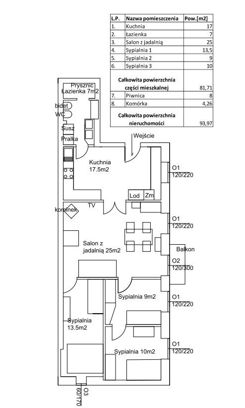 • Powierzchnia użytkowa mieszkania 81,71m2 (całkowita powierzchnia nieruchomości 93,97m2)