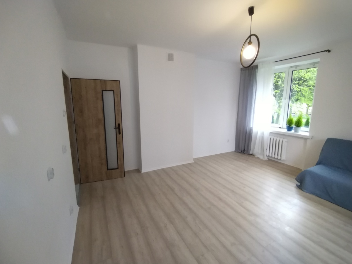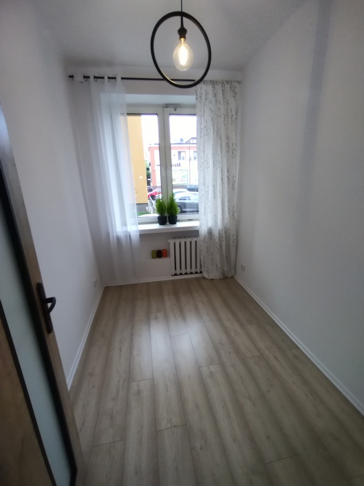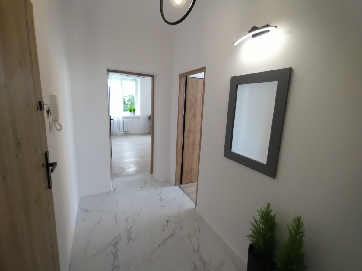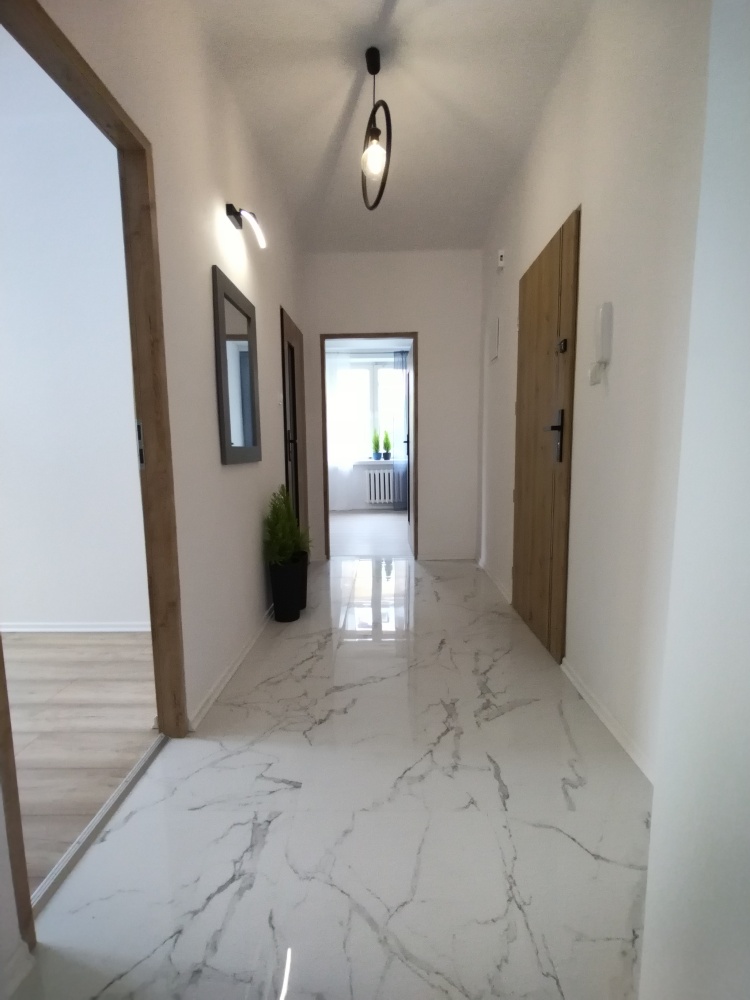 Wyremontowane, gotowe do wprowadzenia mieszkanie na parterze - 3 pokoje, kuchnia w aneksie, przedpokój, łazienka oraz piwnica. Mieszkanie dwustronne z oknami na wschód i zachód. Okna plastikowe, na podłogach panele i gres, na ścianach gładzie gipsowe. Nowe drzwi wejściowe i pokojowe. Pokoje duże w regularnych kształtach. Wymieniona instalacja wody, prądu i kanalizacji. Łazienka kompletna z kabiną prysznicową, umywalką i wc, dodatkowo przygotowana instalacja pod pralkę i suszarkę. Aneks kuchenny z przewodami elektr. pod kuchnię indukcyjną i kanałem wentylacyjnym. Centralne ogrzewanie, ciepła i zimna woda - z sieci miejskiej. Brak podzielników ciepła. Bardzo duża przynależna piwnica. Blokiem zarządza wspólnota mieszkaniowa. Blok 2-piętrowy, zbudowany z pełnej cegły, dodatkowo ocieplony, położony w osiedlowym zadrzewieniu. Bardzo małe straty cieplne. Przed blokiem duży parking. Klatki schodowe czyste, wejścia do klatek zabezpieczone domofonem. Budynek stoi z dala od ruchliwych i głośnych ulic – jest cicho i komfortowo. Blisko do stacji PKP, szkoły i przedszkola, dużo punktów handlowych i usługowych.