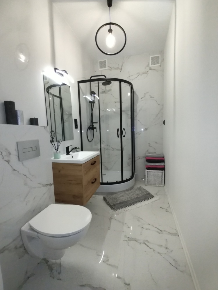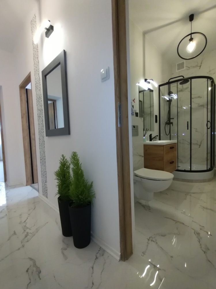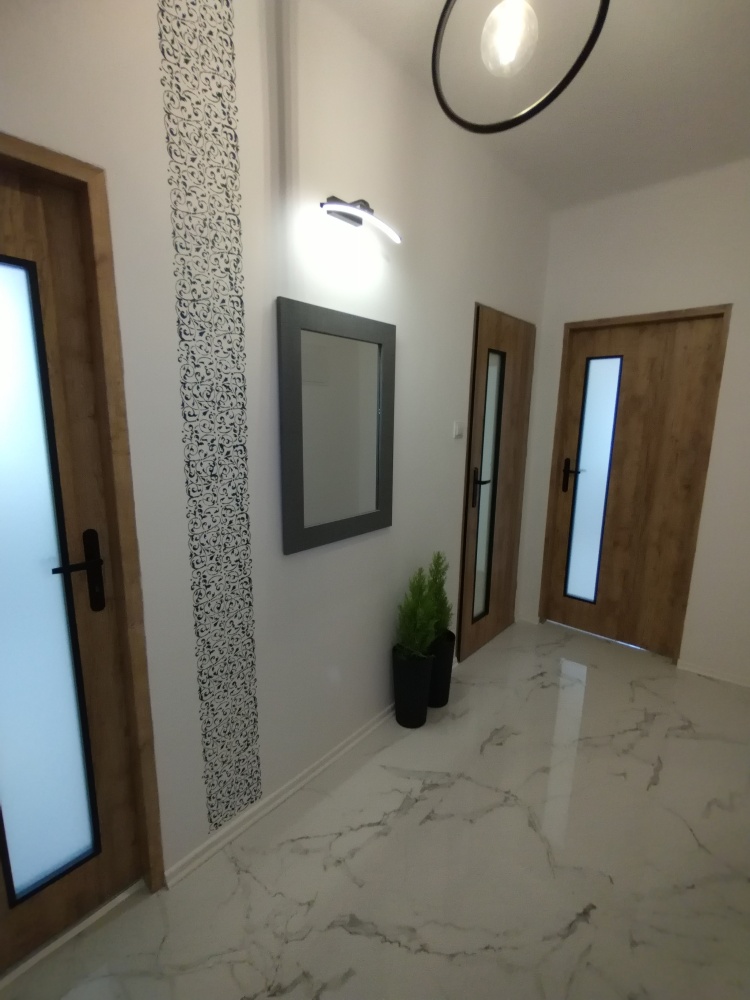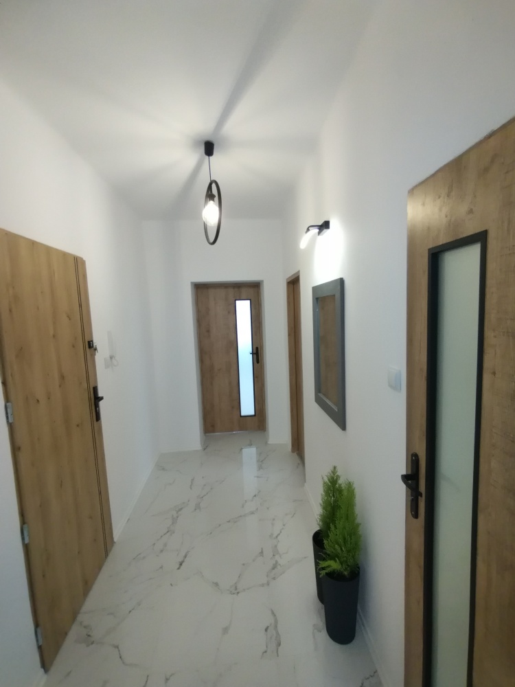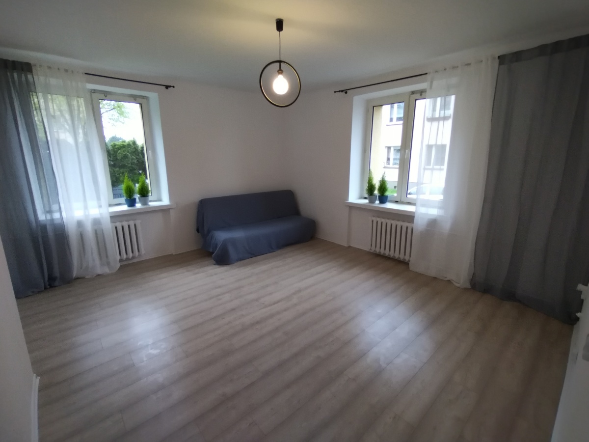 Wyremontowane, gotowe do wprowadzenia mieszkanie na parterze - 3 pokoje, kuchnia w aneksie, przedpokój, łazienka oraz piwnica. Mieszkanie dwustronne z oknami na wschód i zachód. Okna plastikowe, na podłogach panele i gres, na ścianach gładzie gipsowe. Nowe drzwi wejściowe i pokojowe. Pokoje duże w regularnych kształtach. Wymieniona instalacja wody, prądu i kanalizacji. Łazienka kompletna z kabiną prysznicową, umywalką i wc, dodatkowo przygotowana instalacja pod pralkę i suszarkę. Aneks kuchenny z przewodami elektr. pod kuchnię indukcyjną i kanałem wentylacyjnym. Centralne ogrzewanie, ciepła i zimna woda - z sieci miejskiej. Brak podzielników ciepła. Bardzo duża przynależna piwnica. Blokiem zarządza wspólnota mieszkaniowa. Blok 2-piętrowy, zbudowany z pełnej cegły, dodatkowo ocieplony, położony w osiedlowym zadrzewieniu. Bardzo małe straty cieplne. Przed blokiem duży parking. Klatki schodowe czyste, wejścia do klatek zabezpieczone domofonem. Budynek stoi z dala od ruchliwych i głośnych ulic – jest cicho i komfortowo. Blisko do stacji PKP, szkoły i przedszkola, dużo punktów handlowych i usługowych.