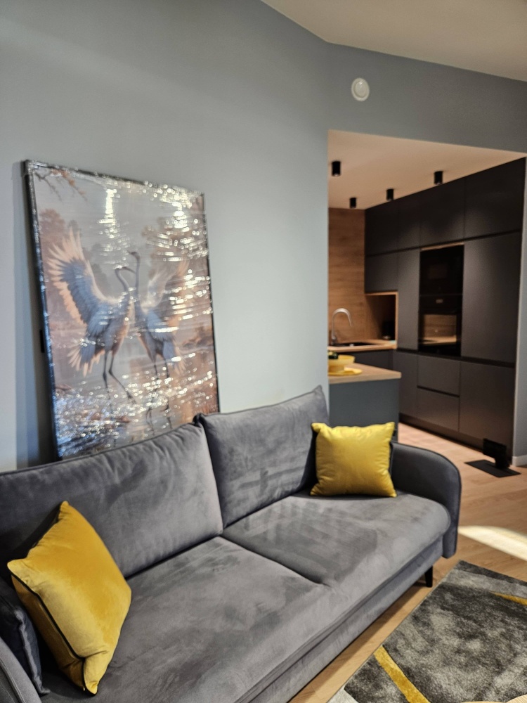 Przestronna, doskonale doświetlona strefa dzienna z panoramicznymi przeszkleniami i wyjściem na loggię. Aneks kuchenny w pełni wyposażony w wysokiej klasy sprzęt AGD, z zabudową wykonaną na wymiar.