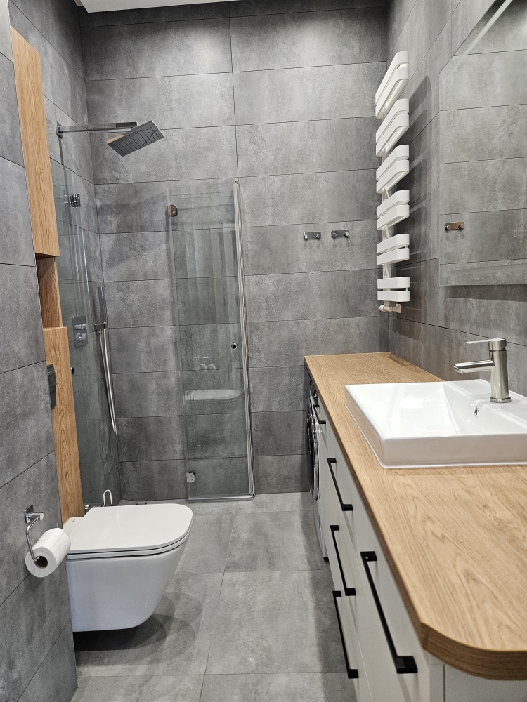 • Łazienka – ca 5 m², z prysznicem typu walk-in,pralko-suszarka , umywalka i toaleta .