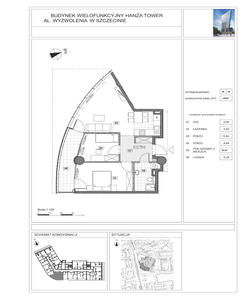 Zamieszkaj w sercu Szczecina – w nowoczesnym, doskonale zaprojektowanym apartamencie w prestiżowej inwestycji Hanza Tower. To wyjątkowa oferta dla osób ceniących wysoki standard, funkcjonalność i styl, z dostępem do luksusowych udogodnień w samym centrum miasta Komfortowy apartament 3-pokojowy w Hanza Tower | 60,85 m² + loggia 8 m² | 10. piętro | Basen | Garaż .• ZESTAWIENIE POWIERZCHNI