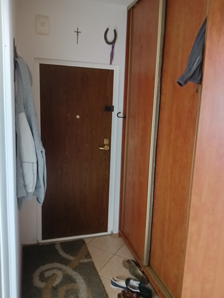 Przedpokój zabudowany szafami, solidne drzwi wejściowe.