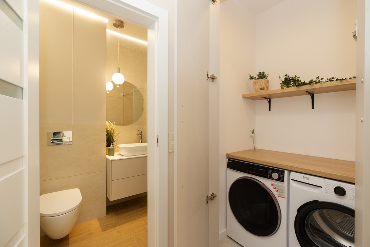 - Oddzielna pralnia, wyposażona w pralkę oraz suszarkę do ubrań.