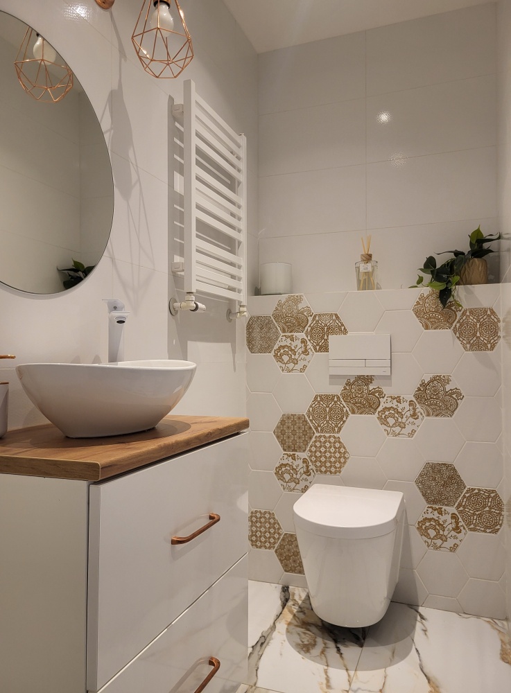 łazienka po remoncie, z kabiną prysznicową walk-in, oraz podgrzewaną podłogą,