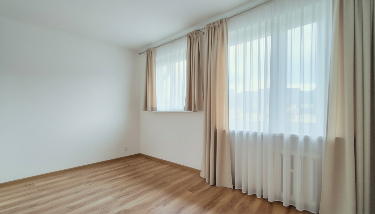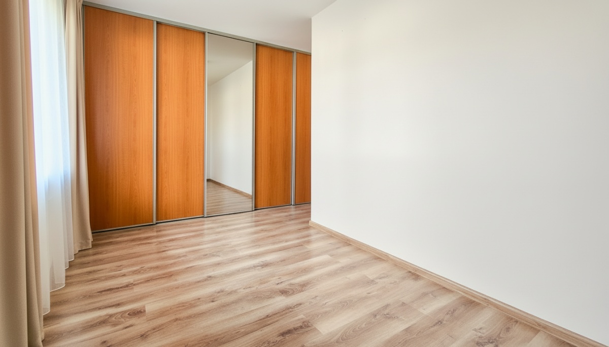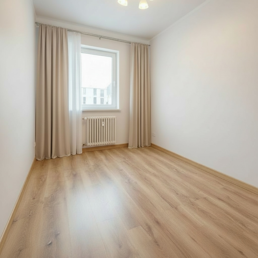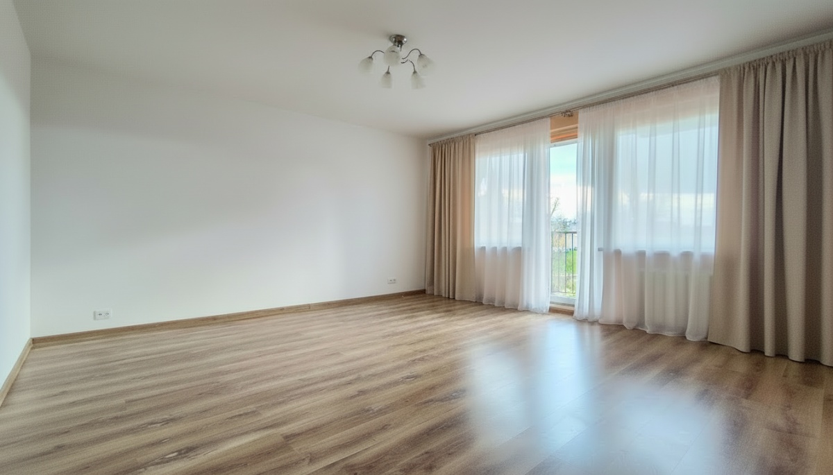 • Spójne wykończenie: jasne ściany i panele w ciepłym odcieniu drewna – mieszkanie gotowe do wprowadzenia po umeblowaniu.