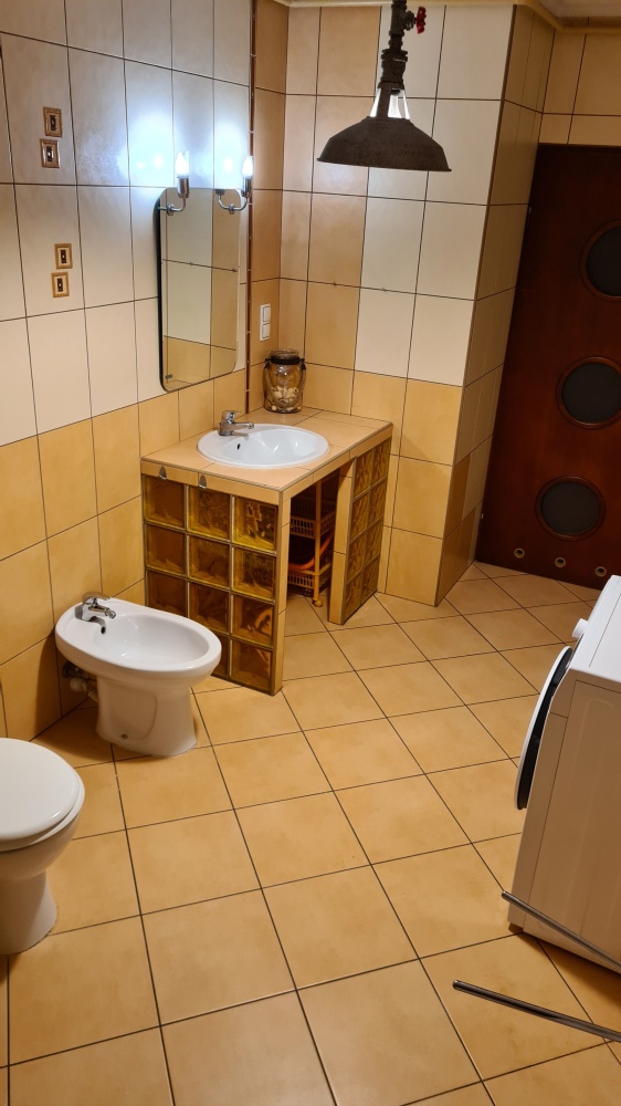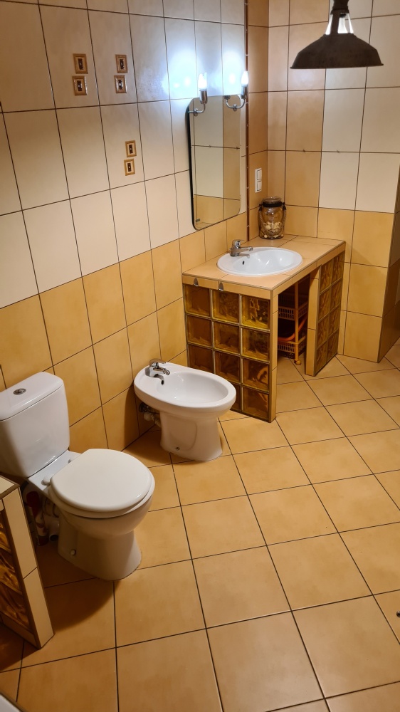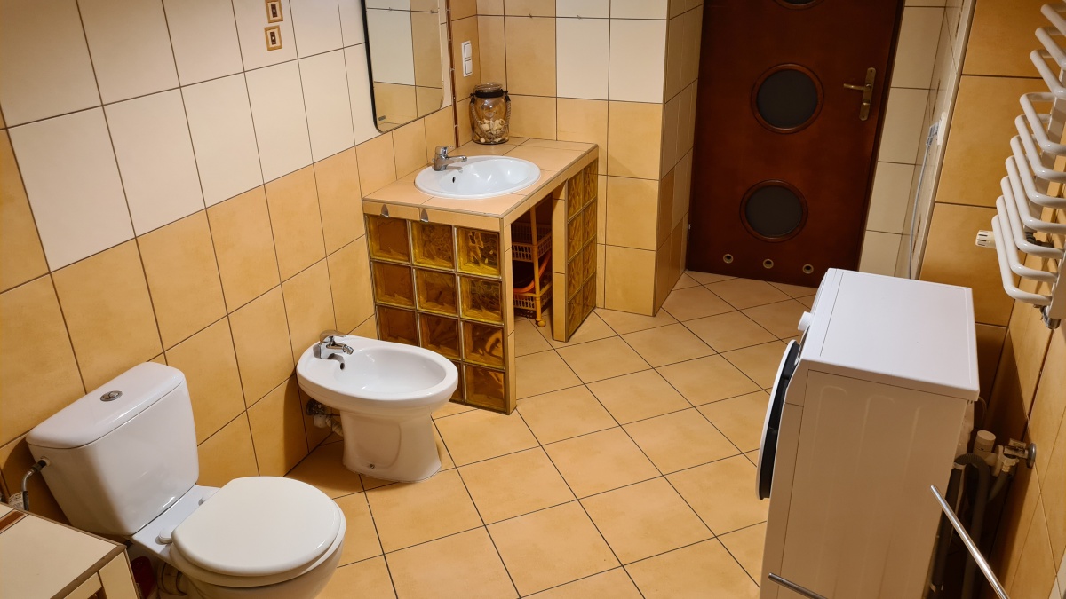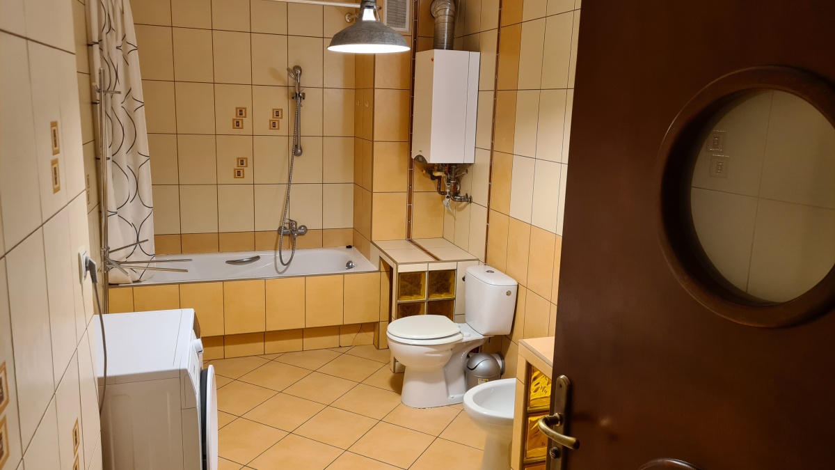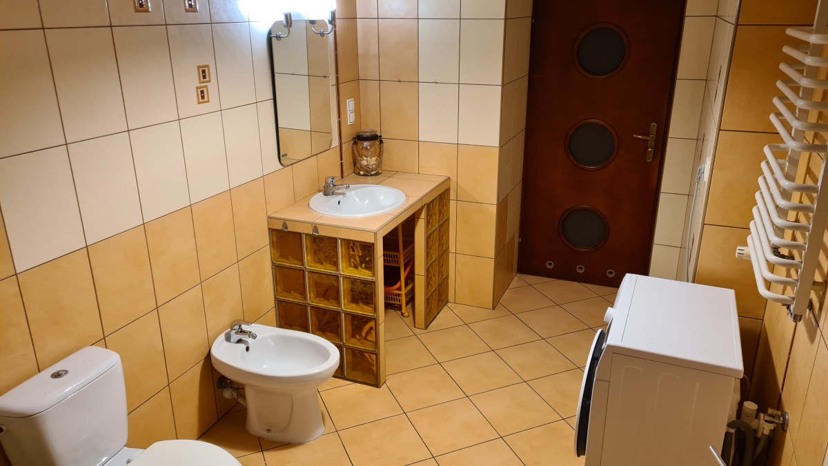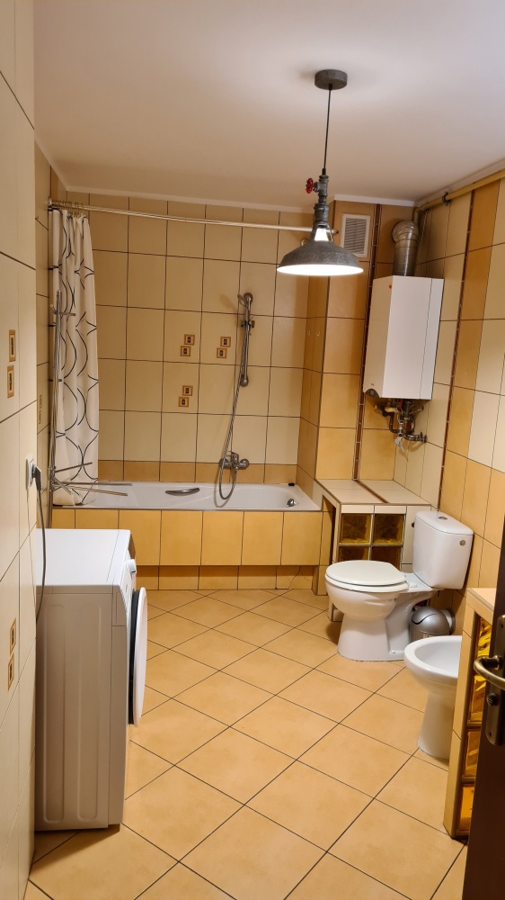 - łazienka z wanną/prysznicem, bidetem, pralką i piecem gazowym dwufunkcyjnym;