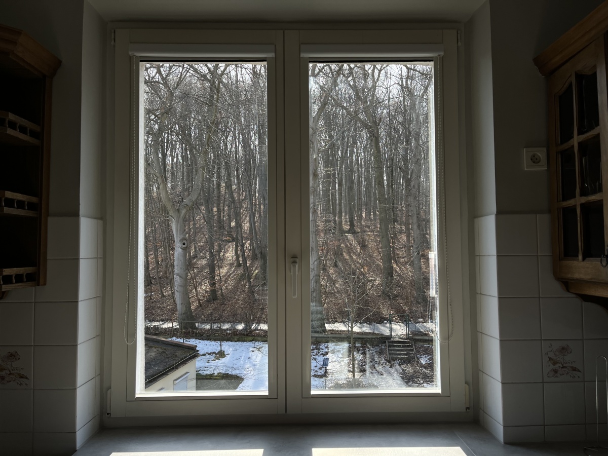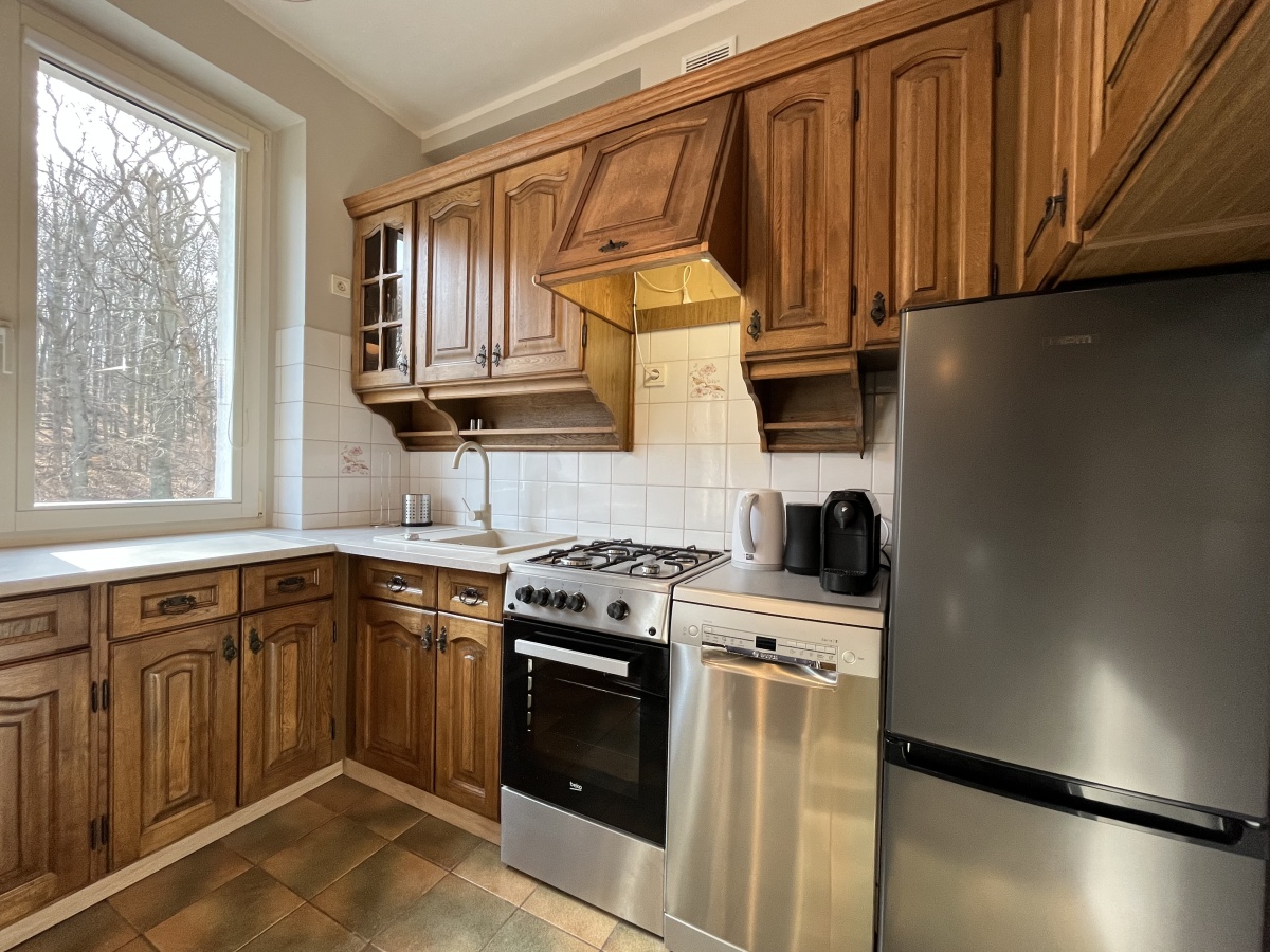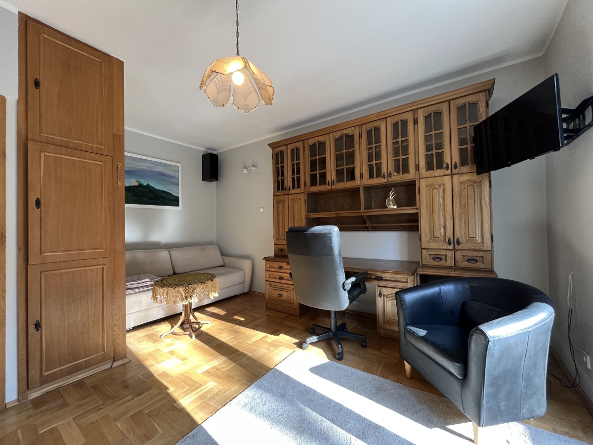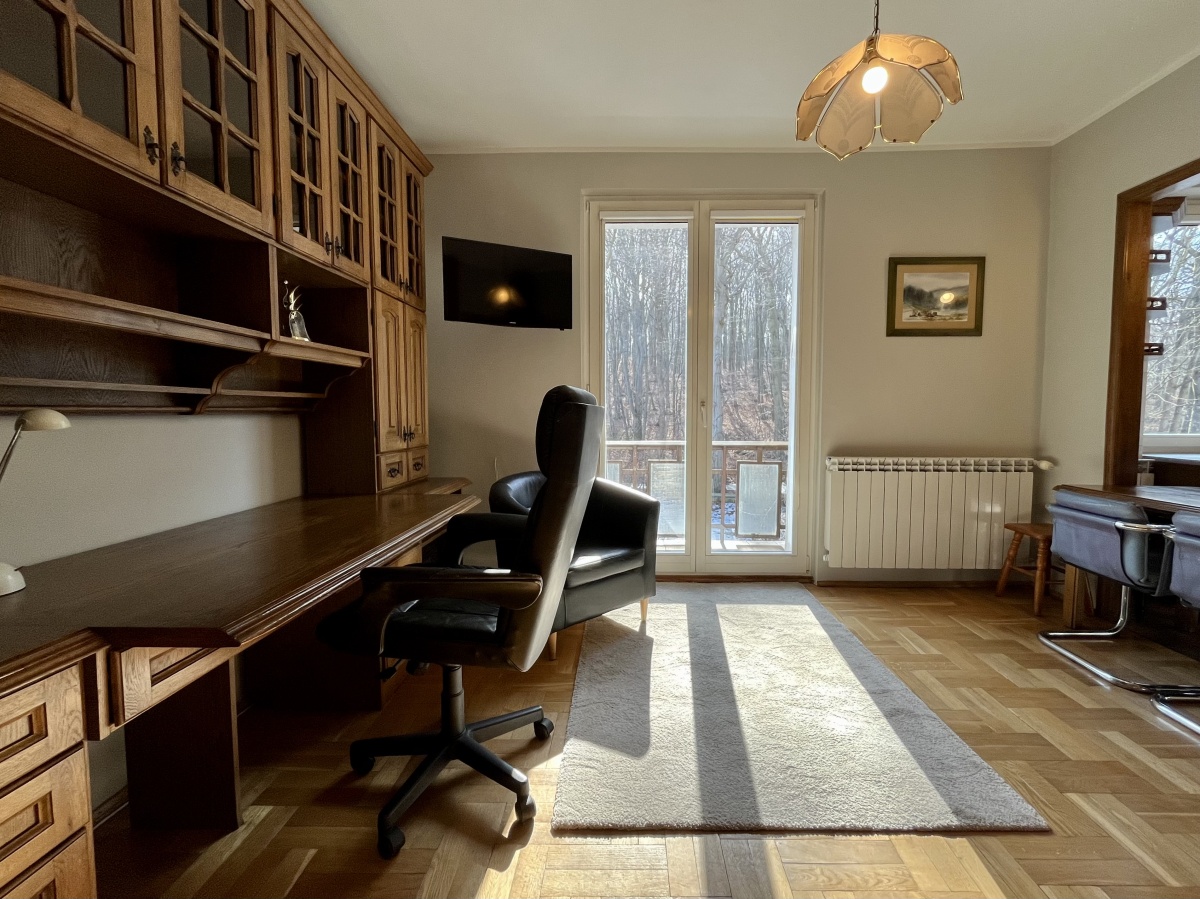 Jasna kawalerka usytuowana na 2 piętrze 3-pietrowej kamienicy ze wspaniałym widokiem na las ze wszystkich okien i balkonu – całe mieszkanie od strony lasu nie ulicy. Podwórko kamienicy z miejscami parkingowymi dla mieszkańców zamykane bramą.