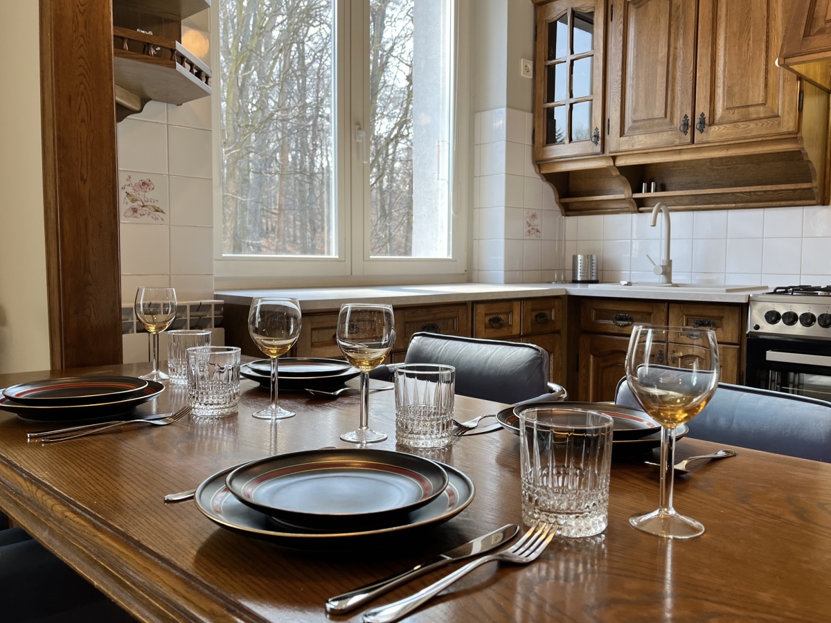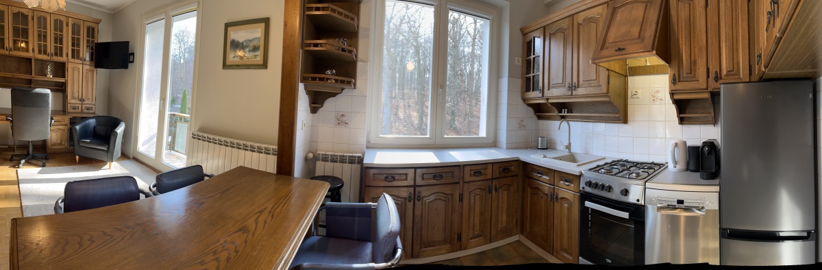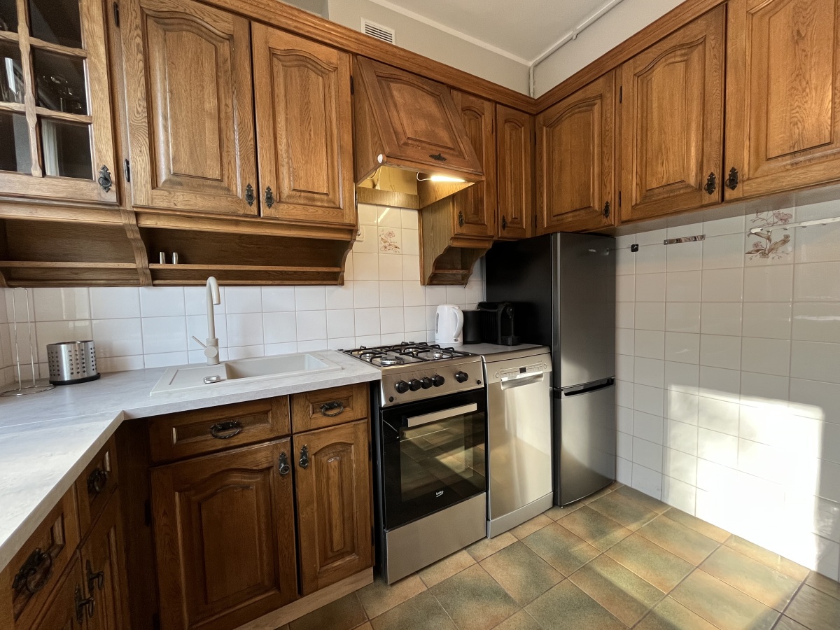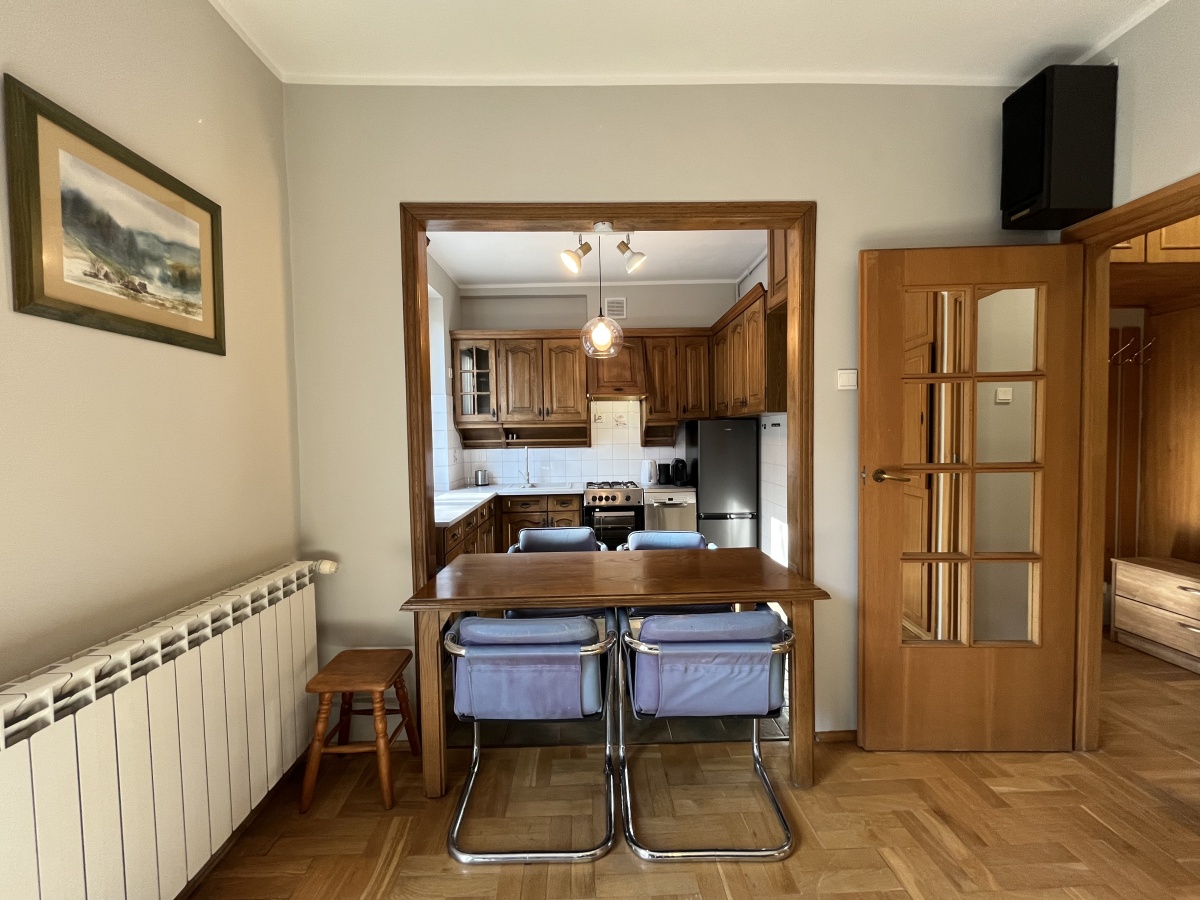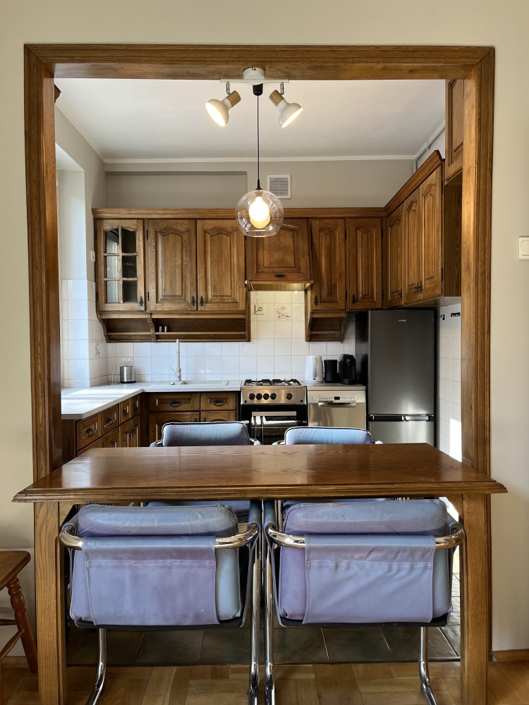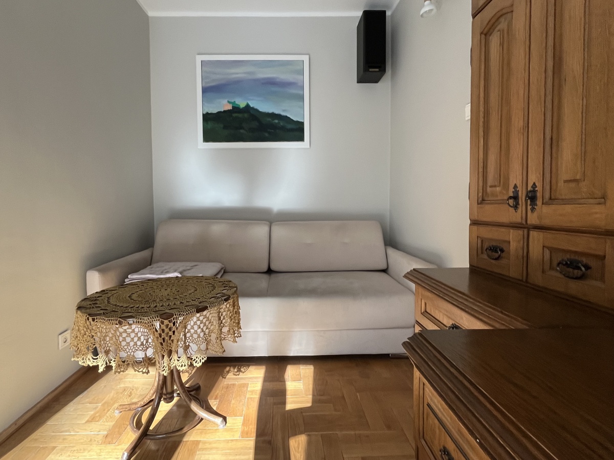 Przestronny salon z wyjściem na balkon połączony jest z wygodną kuchnią. Kuchnia w pełni wyposażona – nowe kuchenka, zmywarka, lodówka, ekspres do kawy, naczynia i sztućce. W salonie kredens z biurkiem, szafa, stół z krzesłami, wygodna rozkładana kanapa, TV. Możliwość podłączenia internetu/TV UPC.