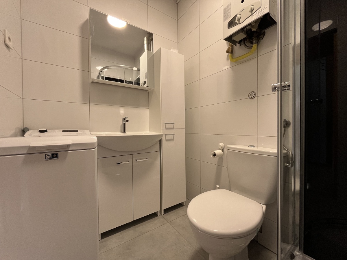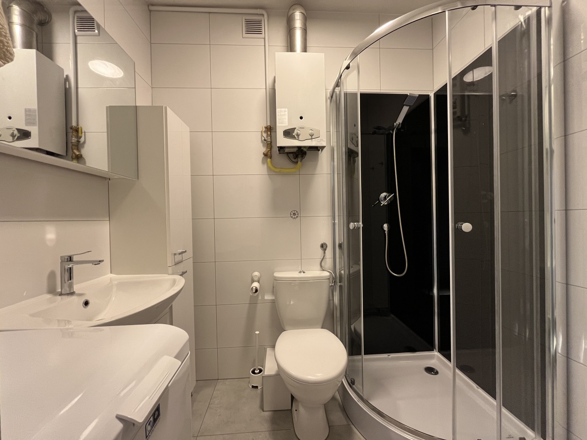 Łazienka nowa z prysznicem, umywalką, WC i pralką.
