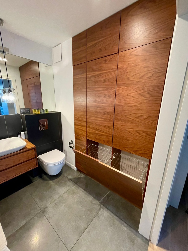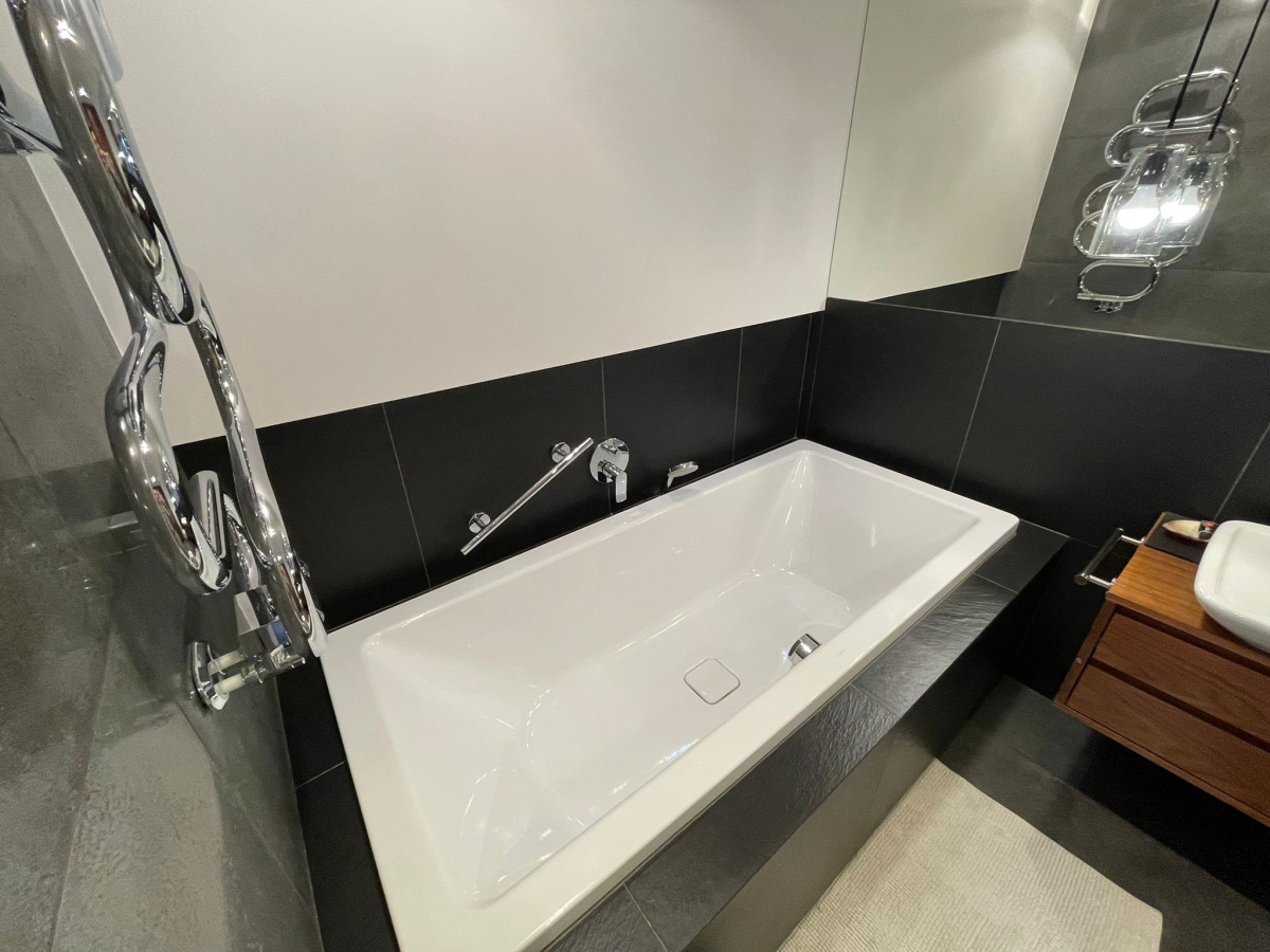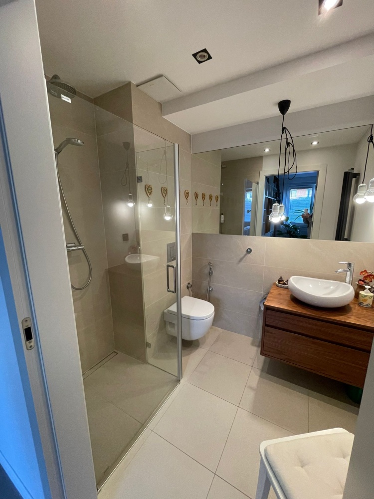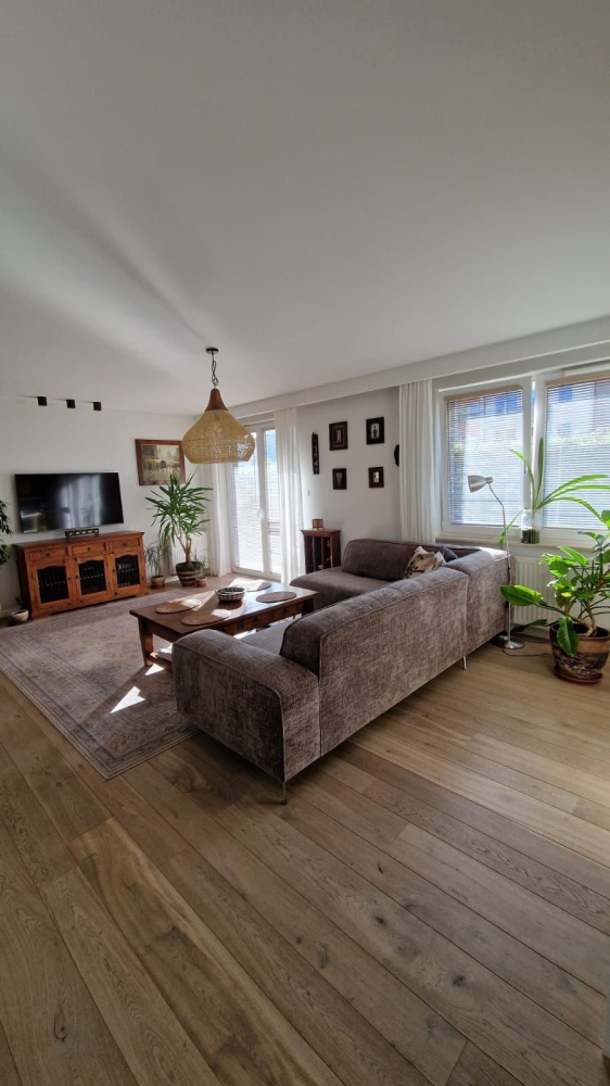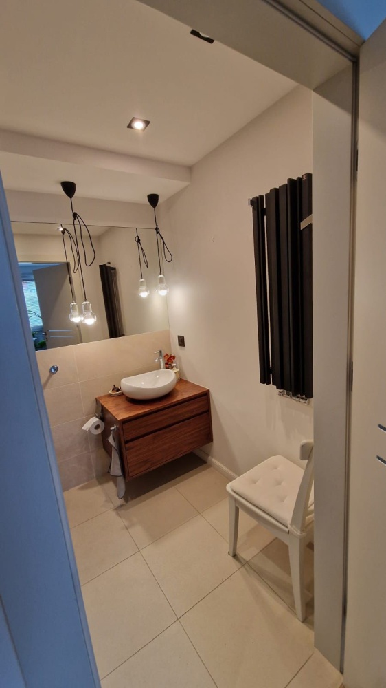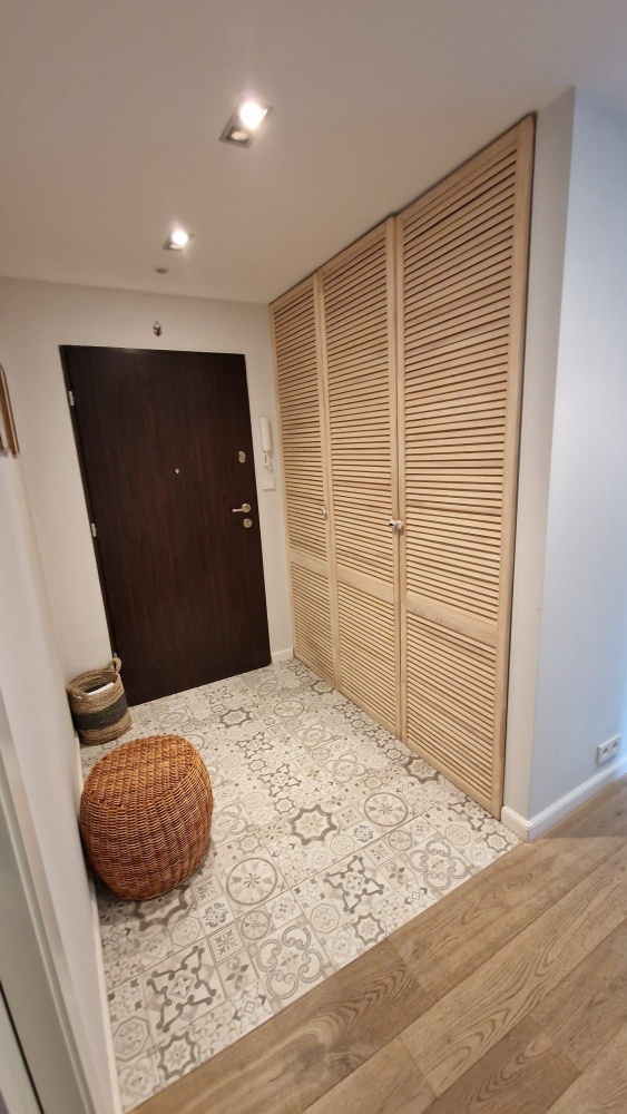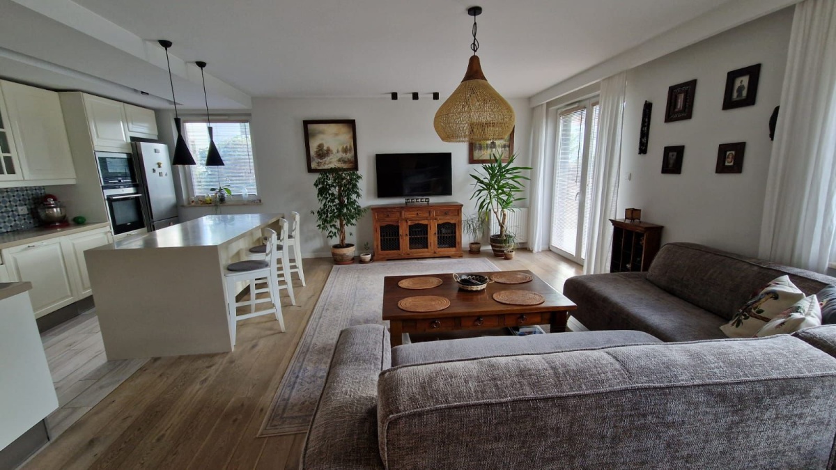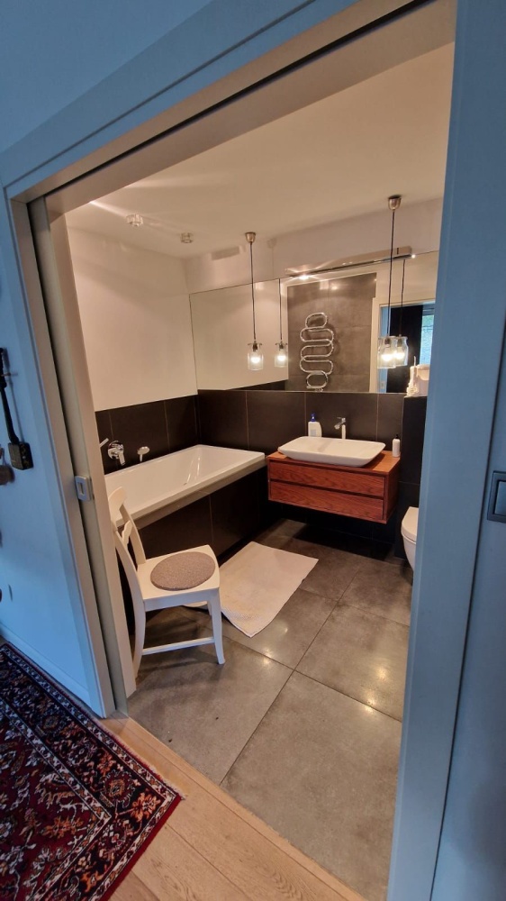 Mieszkanie w wysokim standardzie- drewniane podłogi, drzwi przesuwne, w łazienkach Kaldewei, Duravit, Roca, dekoracyjne grzejniki Terma, podgrzewane lustro, armatura Hansgrohe, Kludi , dwa telewizory Samsung, sprzęty w kuchni Siemens i Bosch, duża lodówka, blat kuchenny (łącznie ze zlewem) i wyspą z konglomeratu (odporne na wysoką temperaturę), kamienne parapety, drewniane żaluzje, podgrzewane podłogi w kuchni i łazience etc. Dużo miejsc do przechowywania dzięki zabudowom w przedpokoju, łazience i sypialni.