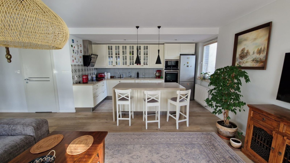 Na powierzchnię 80m2 składa się duży salon z aneksem kuchennym oddzielonym wyspą, sypialnia z prywatną łazienką z wanną, druga sypialnia, łazienka z prysznicem, przedpokój.