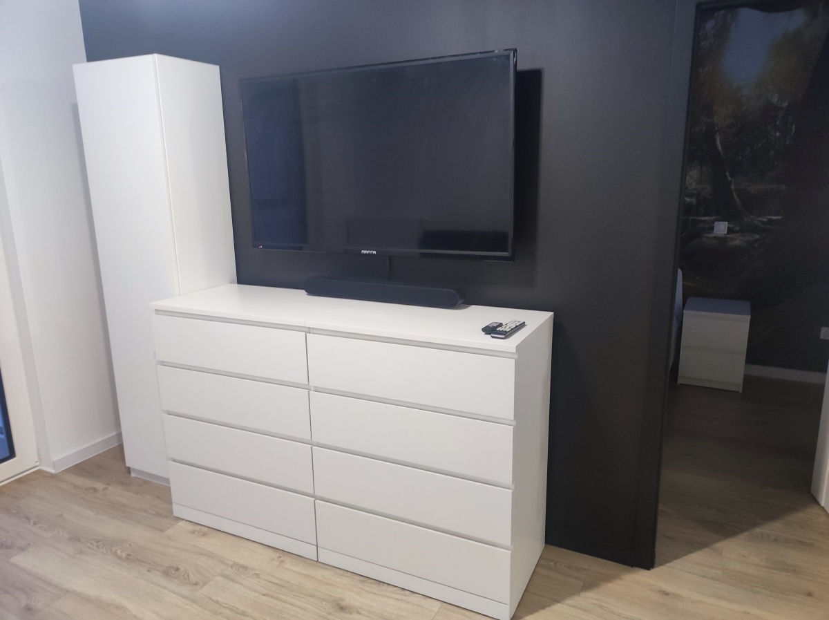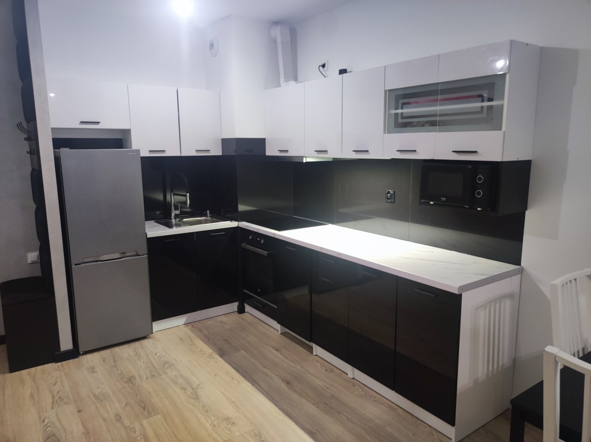 Mieszkanie jest w pełni wyposażone – do dyspozycji najemców są pojemne meble, pralka, lodówka, piekarnik, płyta indukcyjna, zmywarka, duży telewizor, kuchenka mikrofalowa, bezprzewodowy odkurzacz.