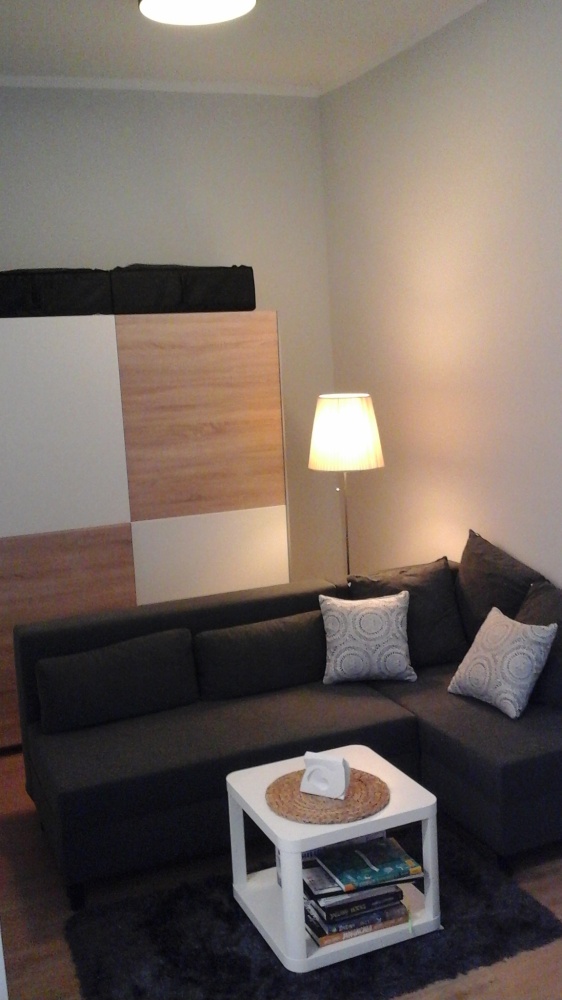 SALON : obszerna szafa 170X190 , kanapa z funkcją spania dla dwóch osób 140x200,stolik jadalniany z możliwością rozłożenia dla 6 osób,telewizor wiszący samsung 32 cale,krzesła rozkładane,dywan,stolik kawowy Ikea,lampa stojąca.