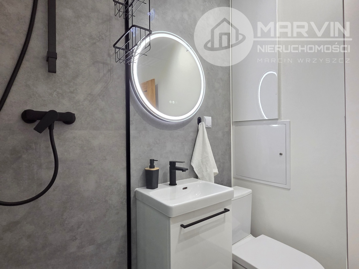 Łazienka – kabina prysznicowa, umywalka z przestronnym lustrem, toaleta, zabudowa oraz pralka