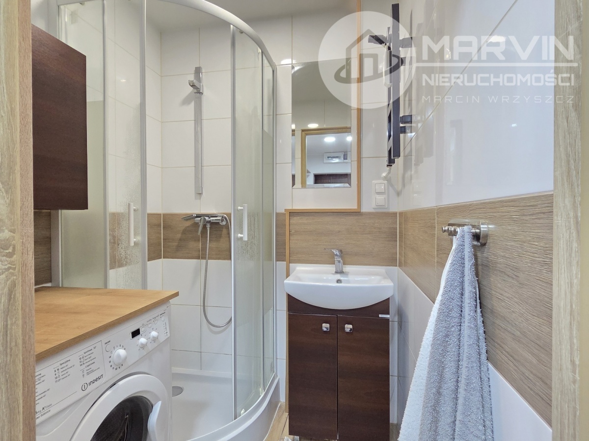 Łazienka 1 - kabina prysznicowa, pralka, umywalka, szafka z lustrem, lustro, regał.
