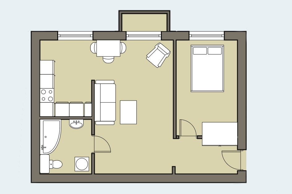 Salon z aneksem kuchennym i wyjściem na balkon, sypialnia, łazienka, niewielki przedpokój, duży schowek w piwnicy.