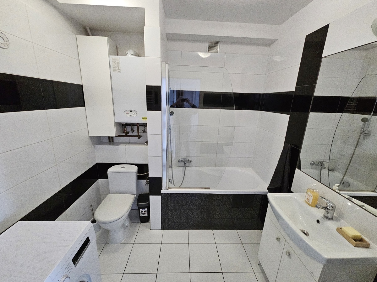 W łazience wanna, wc, szafki, oszczędny piec gazowy dwufunkcyjny.