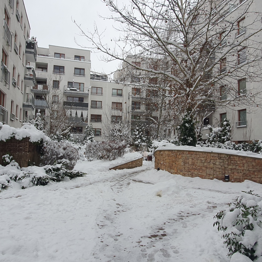 Na zdjęciach mieszkanie oraz park Fort Bema jesienią oraz osiedle zimą.