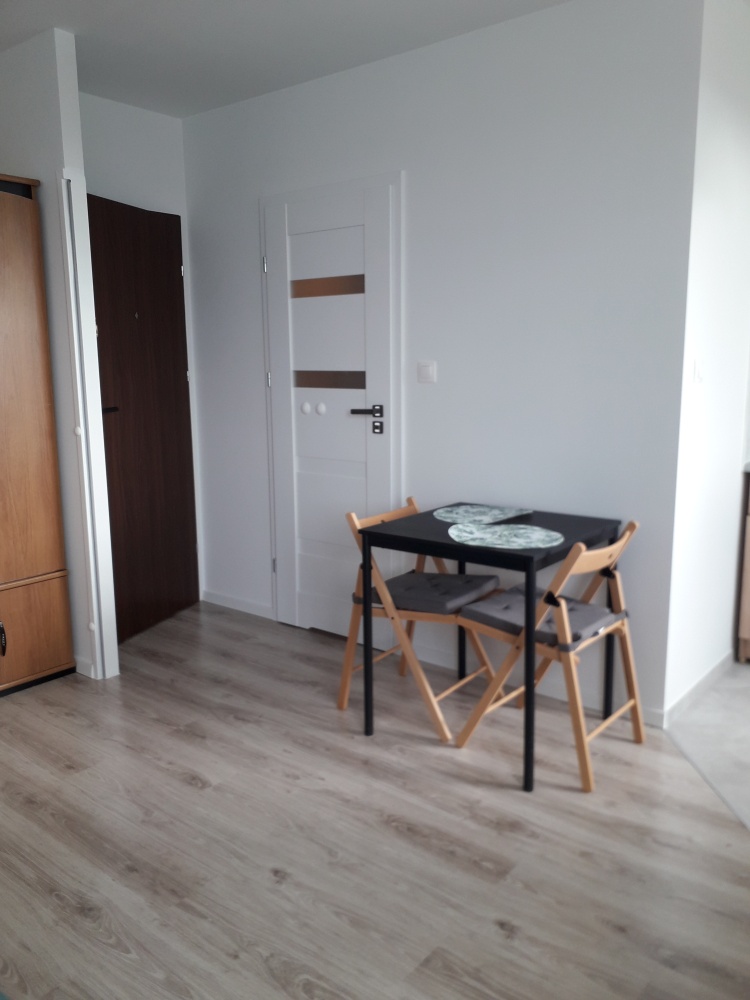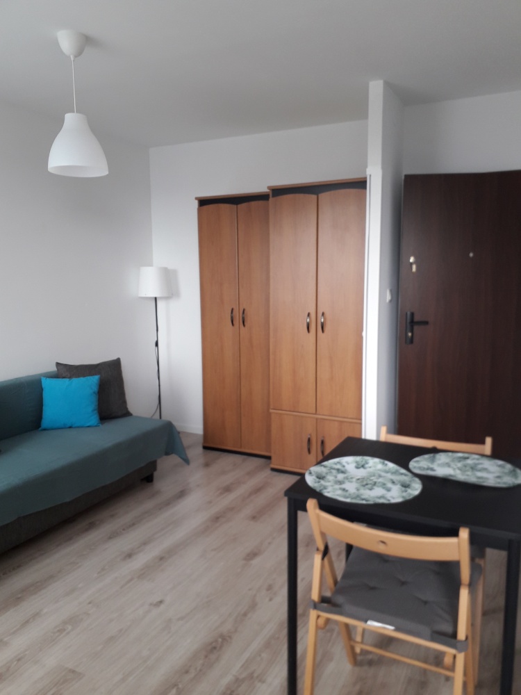 Salon z aneksem kuchennym i urządzona łazienka. Mieszkanie całkowicie wyposażone, do zamieszkania.