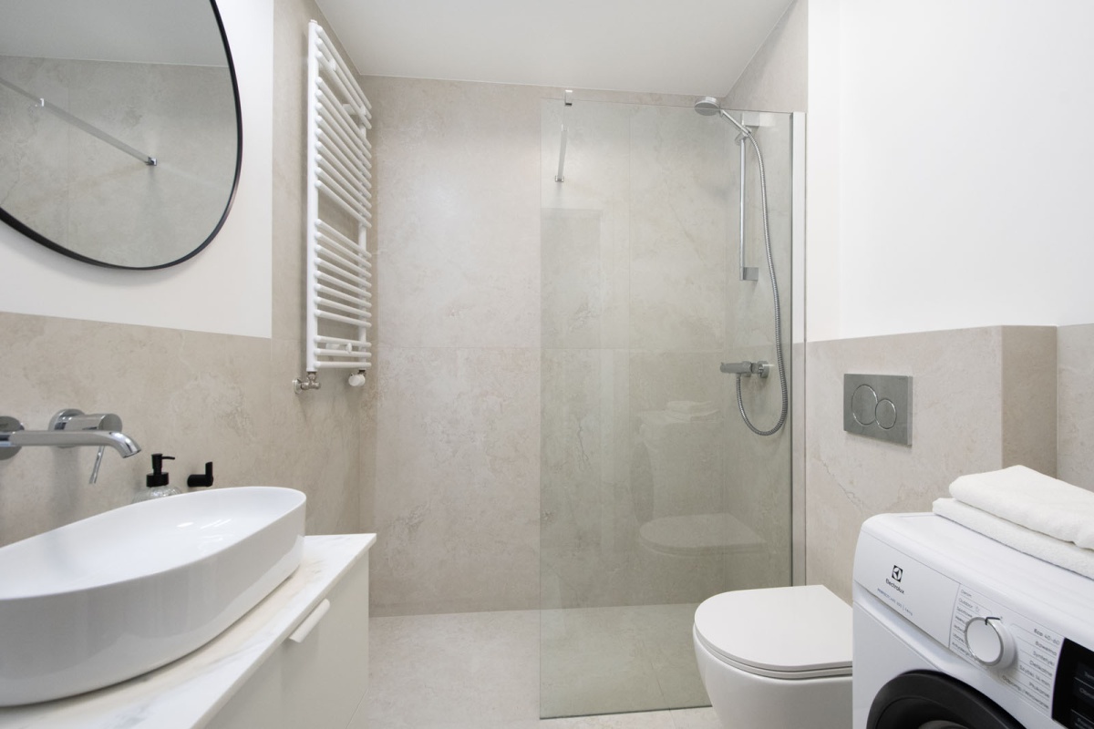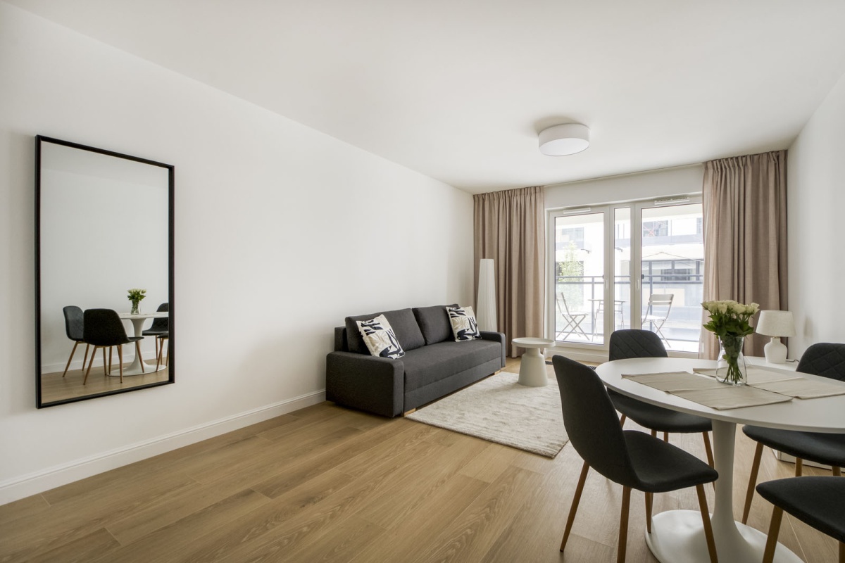 Mieszkanie typu studio o powierzchni 34 m2 składa się z salonu wyposażonego w rozkładaną sofę, aneksu kuchennego, łazienki z prysznicem walk-in oraz balkonu.