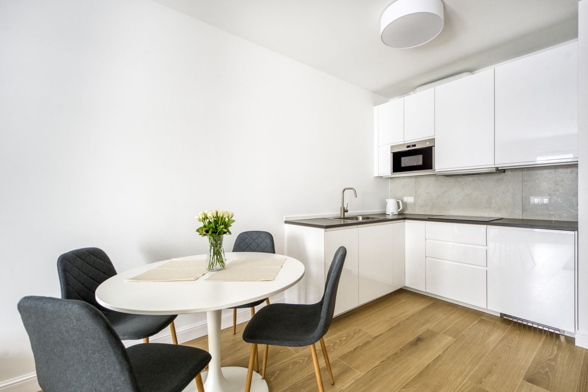 STANDARD: The apartment is located on the 1st floor of a building built by Matexi ("Na Okrzei") in 2025. The apartment is fully furnished and equipped with appliances – fridge with freezer, dishwasher, oven, washing machine, vacuum cleaner, and electric kettle. Available for first-time stay