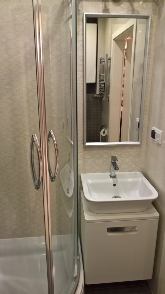 Mieszkanie jest całkowicie umeblowane. W salonie (18 m2) znajdują się: duża rozkładana sofa (nowsza i niż na foto), 2 szafy wkomponowane we wnęki oraz biurko z krzesłem niepokazane na foto) i lampą stojącą. Balkon jest wyposażony w 2 rozkładane fotele i stolik. W kuchni (8 m2) półotwartej na przedpokój znajduje się zabudowa z pełnym wyposażeniem (lodówka z zamrażarką, zmywarka, płyta gazowa, piekarnik elektryczny, wyciąg) oraz stół kuchenny z 2 krzesłami. W przedpokoju (6.5 m2) znajduje się szafa wkomponowana we wnękę oraz wielkie lustro. Łazienka połączona z WC (3 m2) posiada pełnowymiarową kabiną prysznicową, umywalkę, WC, nową pralkę inwerterową (nowsza niż na foto) oraz szafki łazienkowe. (Uwaga: przedstawiony w załączeniu rzut mieszkania różni się nieznacznie w zakresie umeblowania).