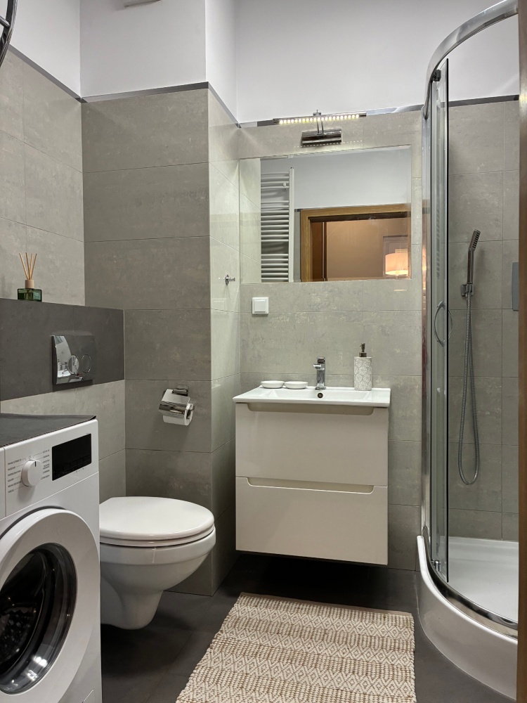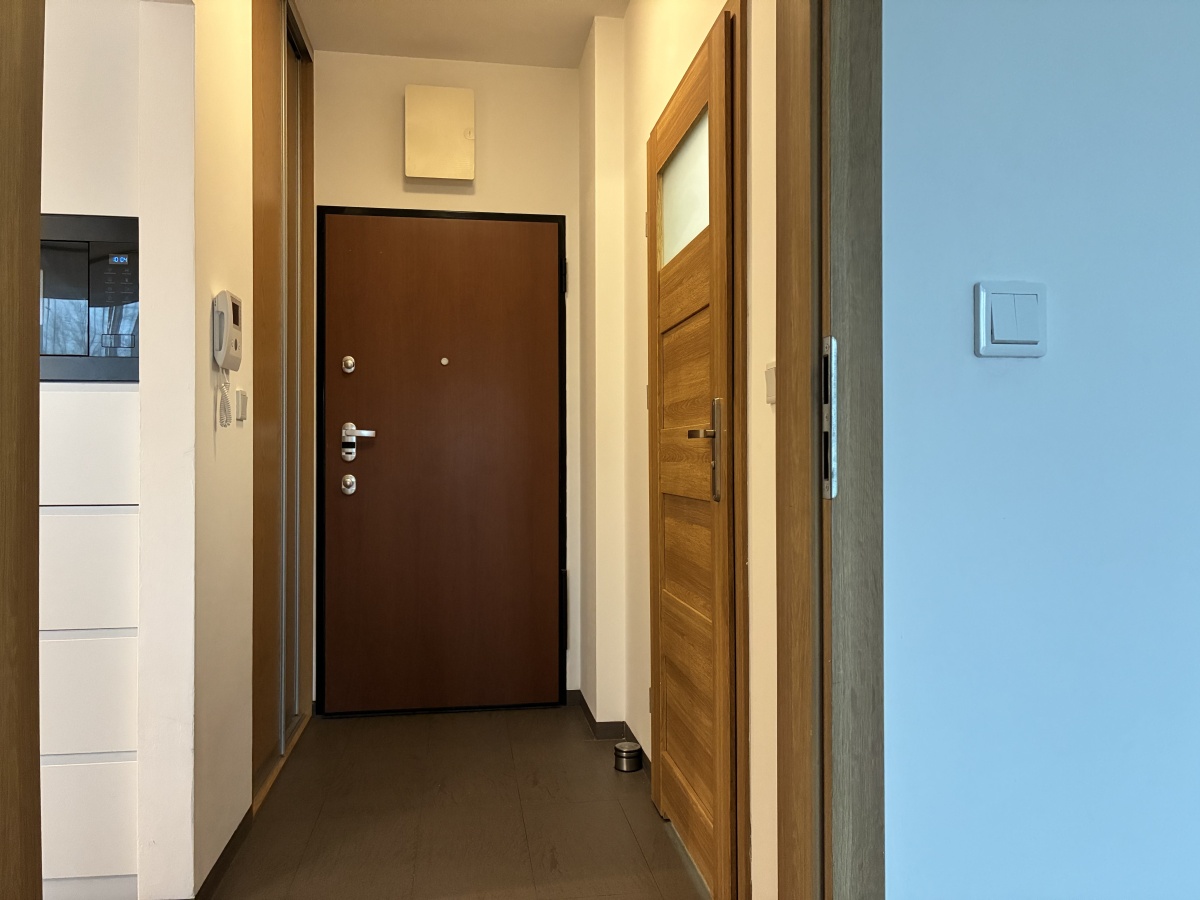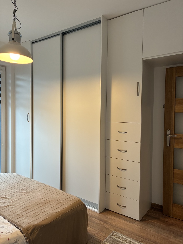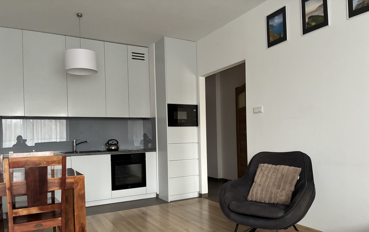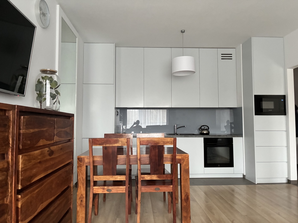 The apartment is fully furnished and was designed for the owner’s own use, with great attention to the quality of materials and functionality of the space. Custom-made furniture maximizes the usable area. New kitchen furniture, high-class household AGD, wooden furniture (table, chairs), additionally a sofa, armchair, chests of drawers, and TV.